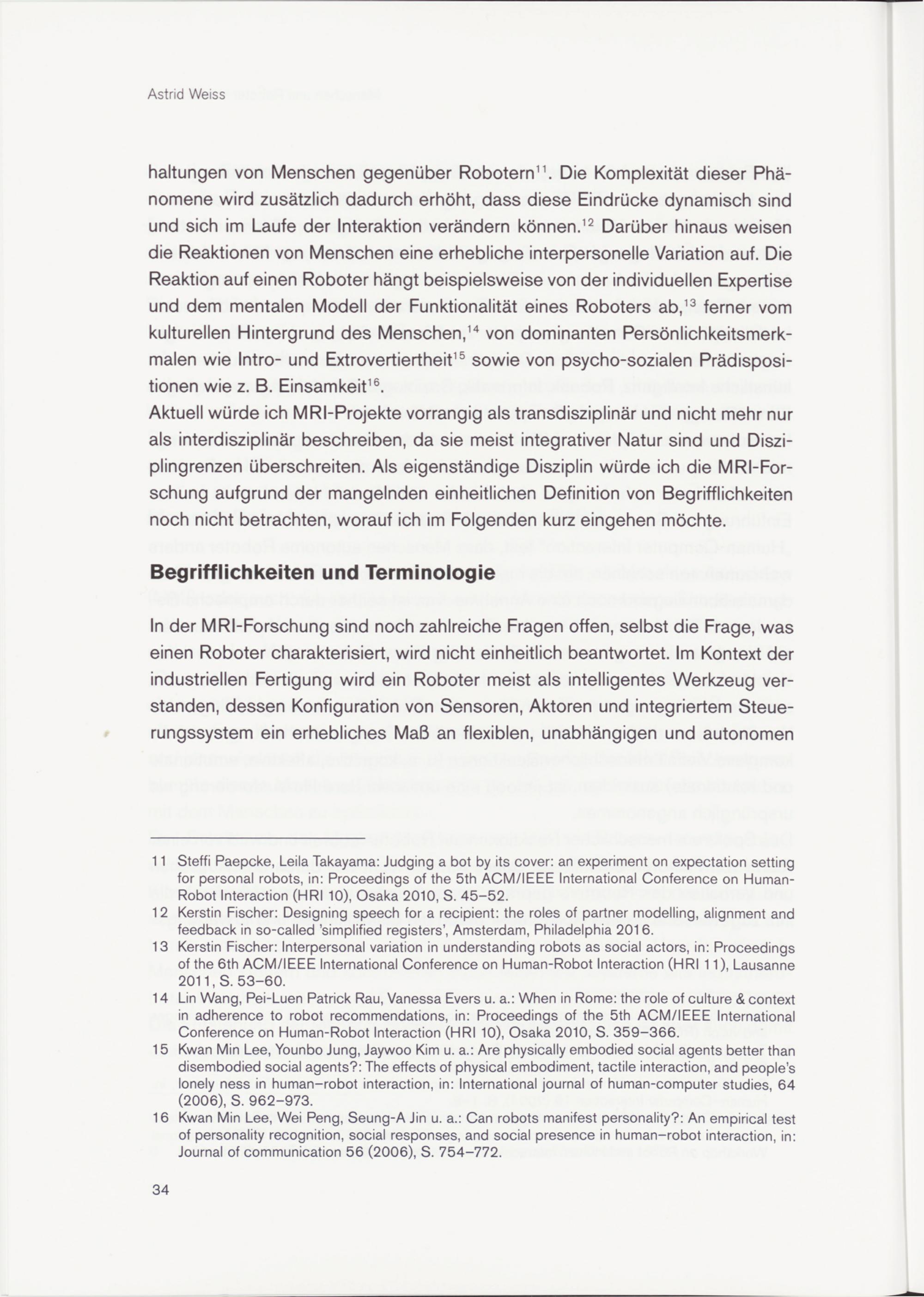 11 Steffi Paepcke, Leila Takayama: Judging a bot by its cover: an experiment on expectation setting for personal robots, in: Proceedings of the 5th ACM/IEEE International Conference on Human- Robot Interaction (HRI 10), Osaka 2010, S. 45-52.