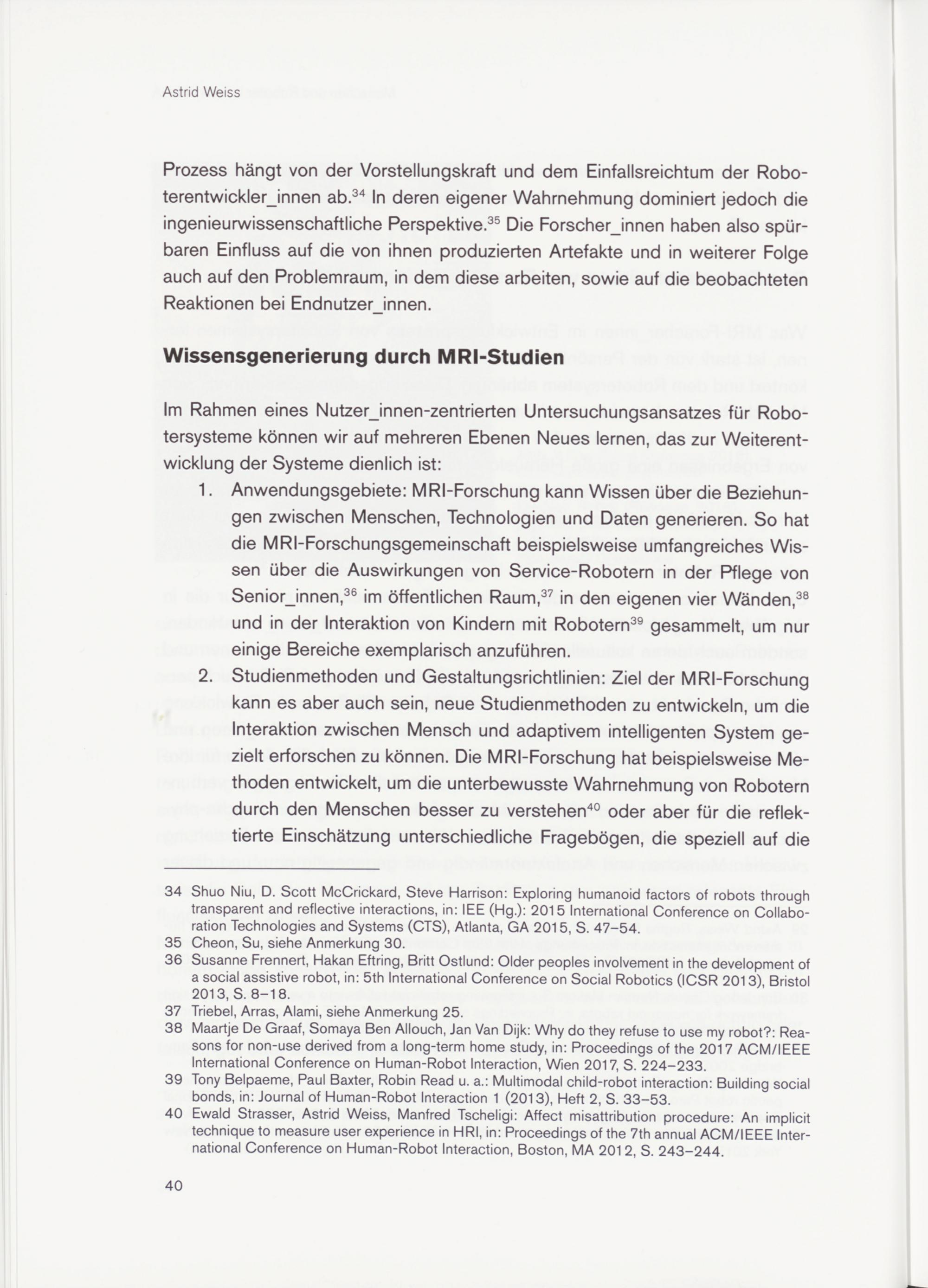 1. Anwendungsgebiete: MRI-Forschung kann Wissen über die Beziehungen zwischen Menschen, Technologien und Daten generieren. So hat die MRI-Forschungsgemeinschaft beispielsweise umfangreiches Wissen über die Auswirkungen von Service-Robotern in der Pflege von Seniorjnnen, 36 im öffentlichen Raum, 37 in den eigenen vier Wänden, 38 und in der Interaktion von Kindern mit Robotern 39 gesammelt, um nur einige Bereiche exemplarisch anzuführen.