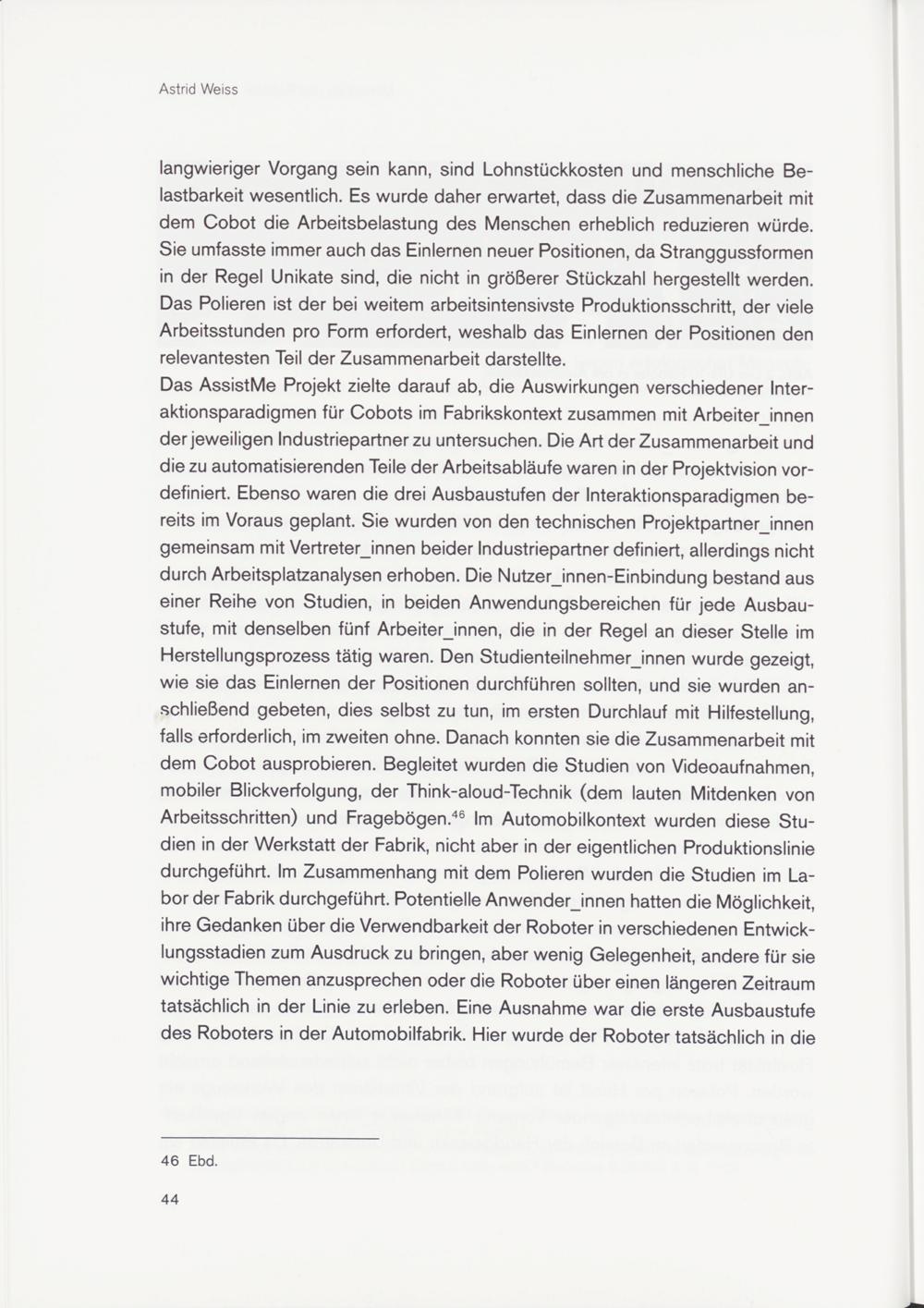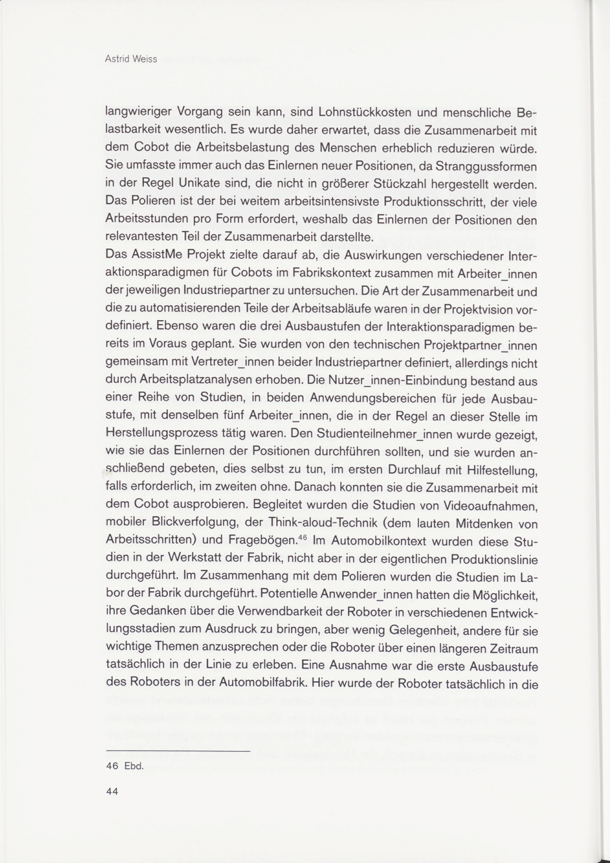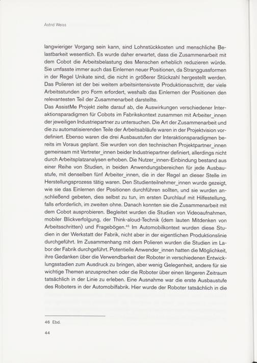 Das AssistMe Projekt zielte darauf ab, die Auswirkungen verschiedener Interaktionsparadigmen für Cobots im Fabrikskontext zusammen mit Arbeiterinnen der jeweiligen Industriepartner zu untersuchen. Die Art der Zusammenarbeit und die zu automatisierenden Teile der Arbeitsabläufe waren in der Projektvision vordefiniert. Ebenso waren die drei Ausbaustufen der Interaktionsparadigmen bereits im Voraus geplant. Sie wurden von den technischen Projektpartnerjnnen gemeinsam mit Vertreterinnen beider Industriepartner definiert, allerdings nicht durch Arbeitsplatzanalysen erhoben. Die Nutzer_innen-Einbindung bestand aus einer Reihe von Studien, in beiden Anwendungsbereichen für jede Ausbaustufe, mit denselben fünf Arbeiterinnen, die in der Regel an dieser Stelle im Herstellungsprozess tätig waren. Den Studienteilnehmerjnnen wurde gezeigt, wie sie das Einlernen der Positionen durchführen sollten, und sie wurden anschließend gebeten, dies selbst zu tun, im ersten Durchlauf mit Hilfestellung, falls erforderlich, im zweiten ohne. Danach konnten sie die Zusammenarbeit mit dem Cobot ausprobieren. Begleitet wurden die Studien von Videoaufnahmen, mobiler Blickverfolgung, der Think-aloud-Technik (dem lauten Mitdenken von Arbeitsschritten) und Fragebögen . 46 Im Automobilkontext wurden diese Studien in der Werkstatt der Fabrik, nicht aber in der eigentlichen Produktionslinie durchgeführt. Im Zusammenhang mit dem Polieren wurden die Studien im Labor der Fabrik durchgeführt. Potentielle Anwender_innen hatten die Möglichkeit, ihre Gedanken über die Verwendbarkeit der Roboter in verschiedenen Entwicklungsstadien zum Ausdruck zu bringen, aber wenig Gelegenheit, andere für sie wichtige Themen anzusprechen oder die Roboter über einen längeren Zeitraum tatsächlich in der Linie zu erleben. Eine Ausnahme war die erste Ausbaustufe des Roboters in der Automobilfabrik. Hier wurde der Roboter tatsächlich in die