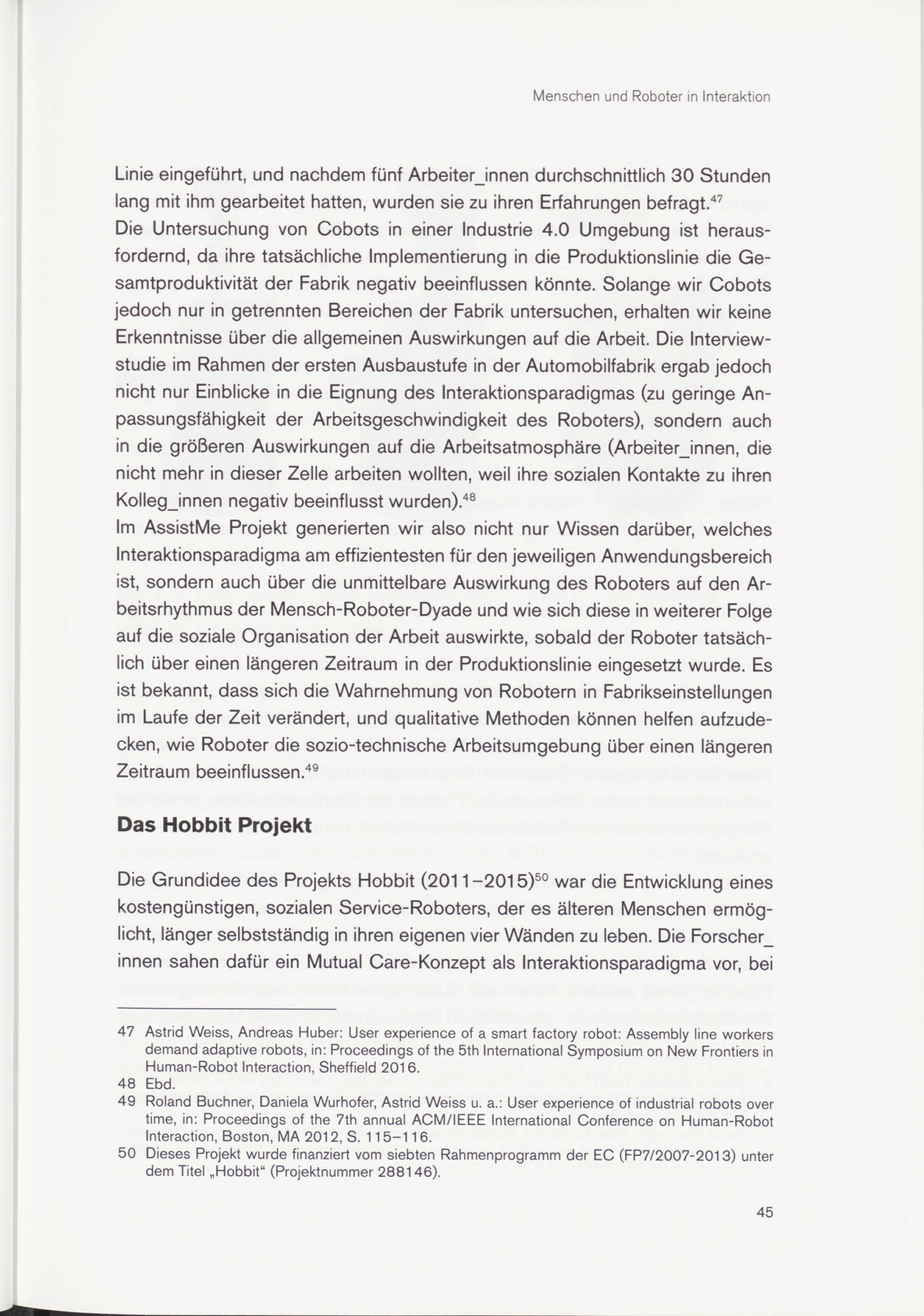 47 Astrid Weiss, Andreas Huber: User experience of a smart factory robot: Assembly line workers demand adaptive robots, in: Proceedings of the 5th International Symposium on New Frontiers in Human-Robot Interaction, Sheffield 2016.