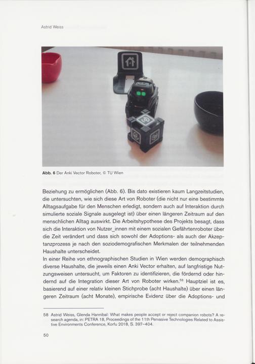 58 Astrid Weiss, Glenda Hannibal: What makes people accept or reject companion robots? A research agenda, in: PETRA 18, Proceedings of the 11 th Pervasive Technologies Related to Assistive Environments Conference, Korfu 2018, S. 397-404.