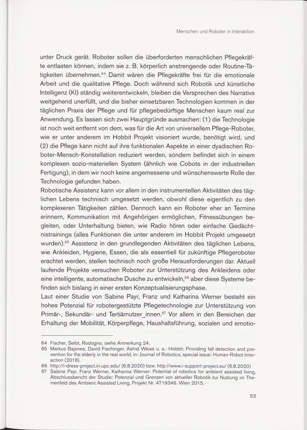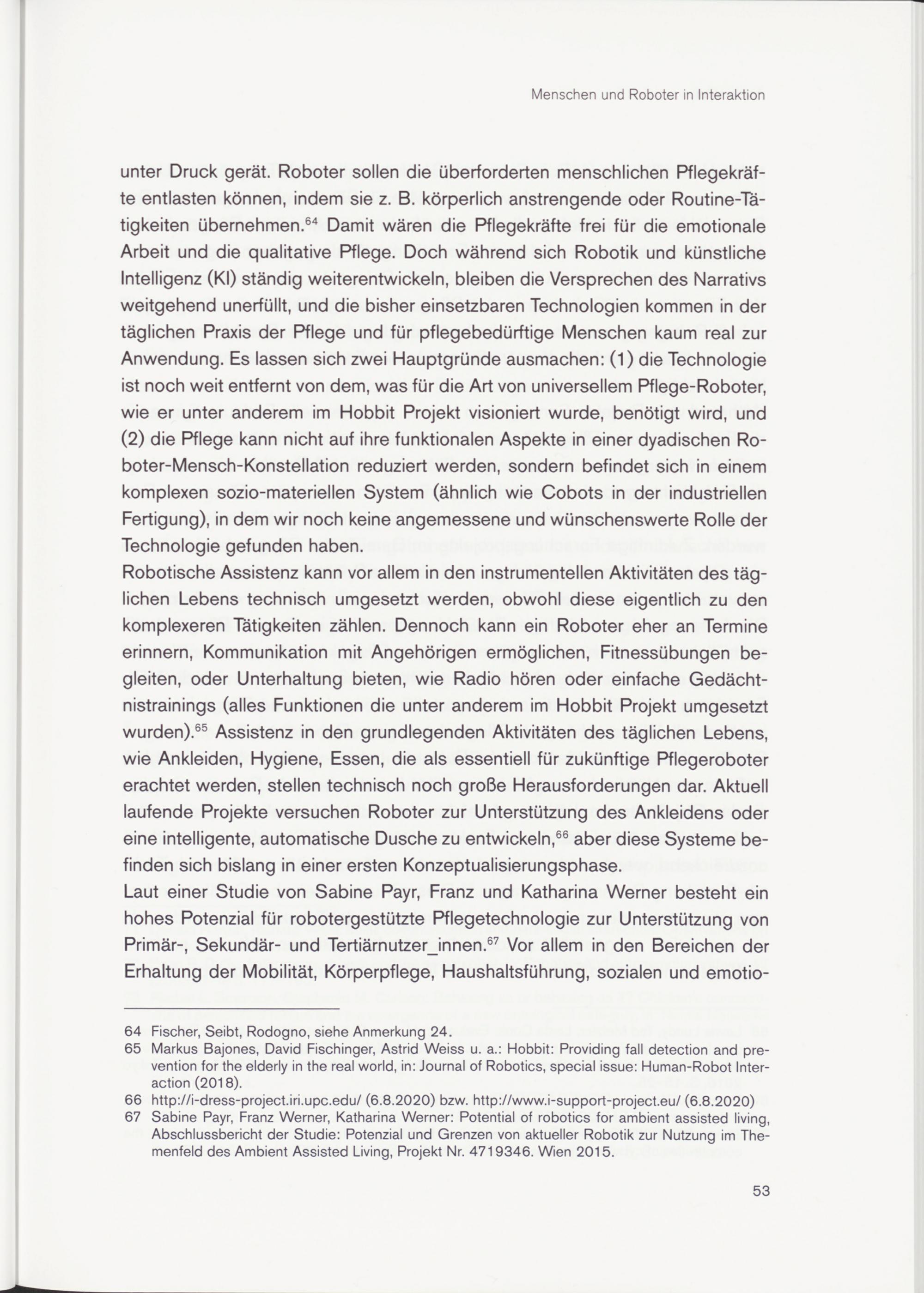 67 Sabine Payr, Franz Werner, Katharina Werner: Potential of robotics for ambient assisted living, Abschlussbericht der Studie: Potenzial und Grenzen von aktueller Robotik zur Nutzung im Themenfeld des Ambient Assisted Living, Projekt Nr. 4719346. Wien 2015.