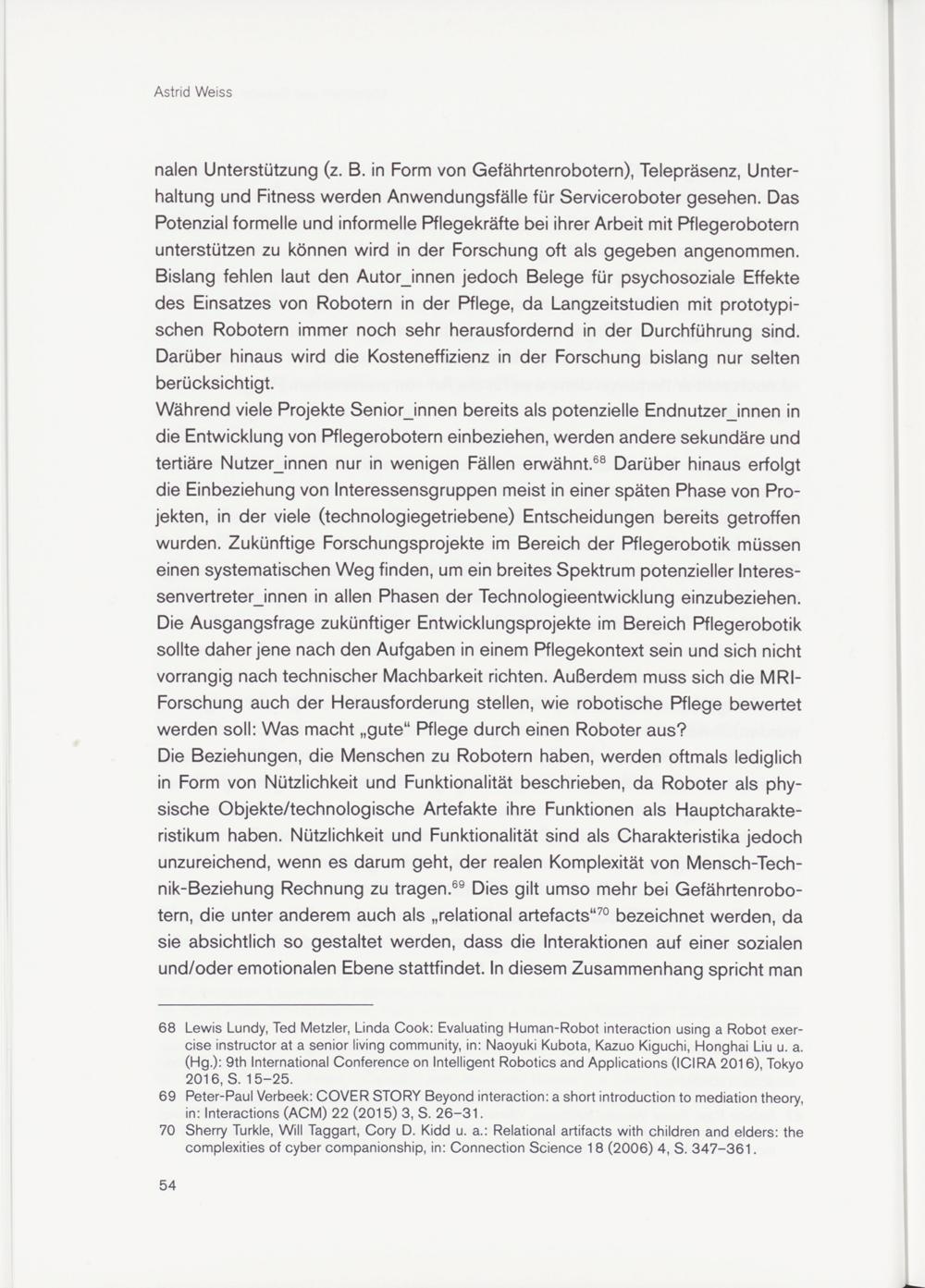 Während viele Projekte Seniorjnnen bereits als potenzielle Endnutzerjnnen in die Entwicklung von Riegerobotern einbeziehen, werden andere sekundäre und tertiäre Nutzerjnnen nur in wenigen Fällen erwähnt . 68 Darüber hinaus erfolgt die Einbeziehung von Interessensgruppen meist in einer späten Phase von Projekten, in der viele (technologiegetriebene) Entscheidungen bereits getroffen wurden. Zukünftige Forschungsprojekte im Bereich der Riegerobotik müssen einen systematischen Weg finden, um ein breites Spektrum potenzieller Interes- senvertreterjnnen in allen Phasen der Technologieentwicklung einzubeziehen. Die Ausgangsfrage zukünftiger Entwicklungsprojekte im Bereich Riegerobotik sollte daher jene nach den Aufgaben in einem Riegekontext sein und sich nicht vorrangig nach technischer Machbarkeit richten. Außerdem muss sich die MRI- Forschung auch der Herausforderung stellen, wie robotische Riege bewertet werden soll: Was macht „gute“ Riege durch einen Roboter aus?