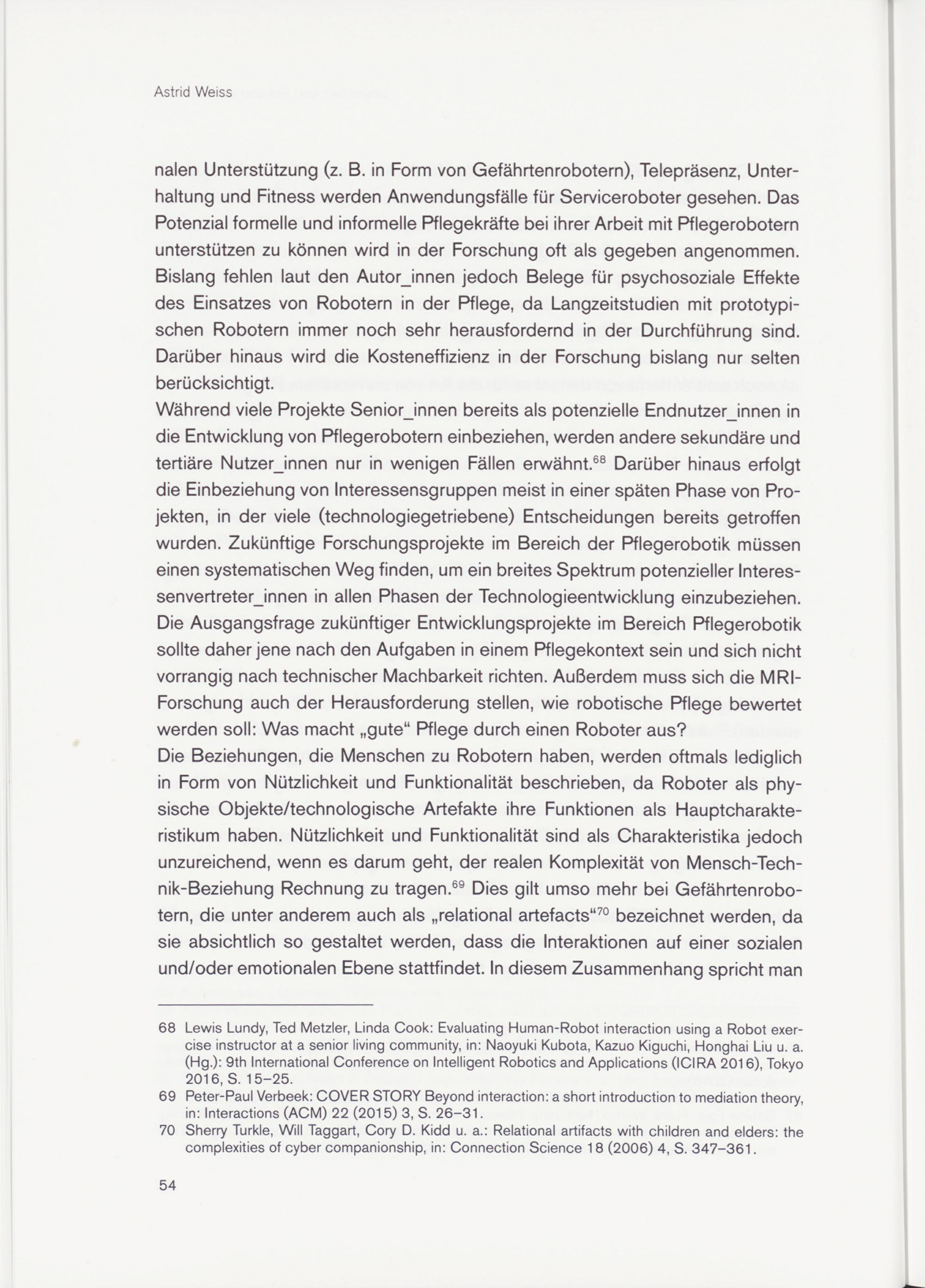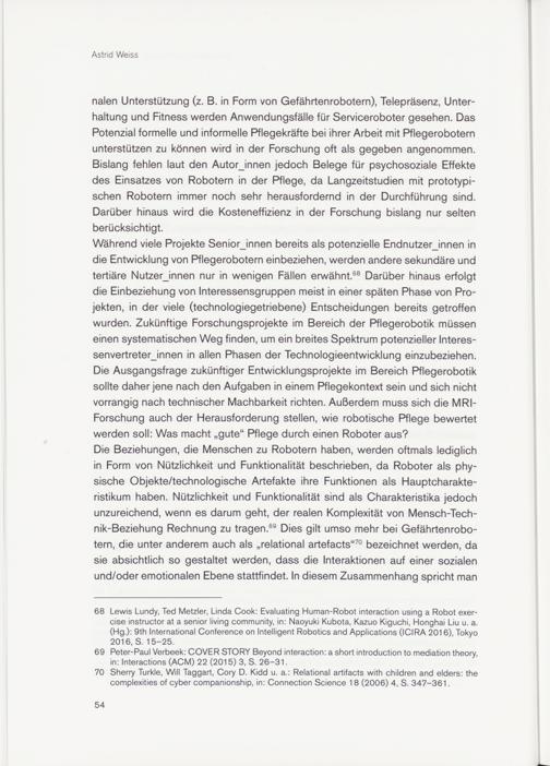 70 Sherry Turkle, Will Taggart, Cory D. Kidd u. a.: Relational artifacts with children and elders: the complexities of cyber companionship, in: Connection Science 18 (2006) 4, S. 347-361.