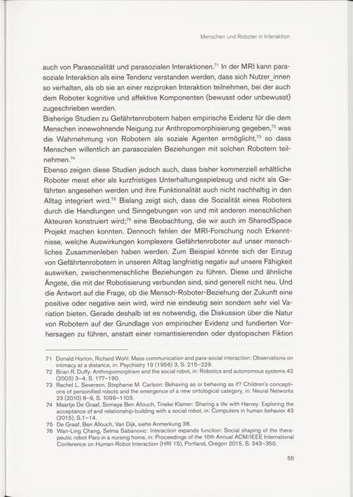 auch von Parasozialität und parasozialen Interaktionen . 71 In der MRI kann parasoziale Interaktion als eine Tendenz verstanden werden, dass sich Nutzerjnnen so verhalten, als ob sie an einer reziproken Interaktion teilnehmen, bei der auch dem Roboter kognitive und affektive Komponenten (bewusst oder unbewusst) zugeschrieben werden.
