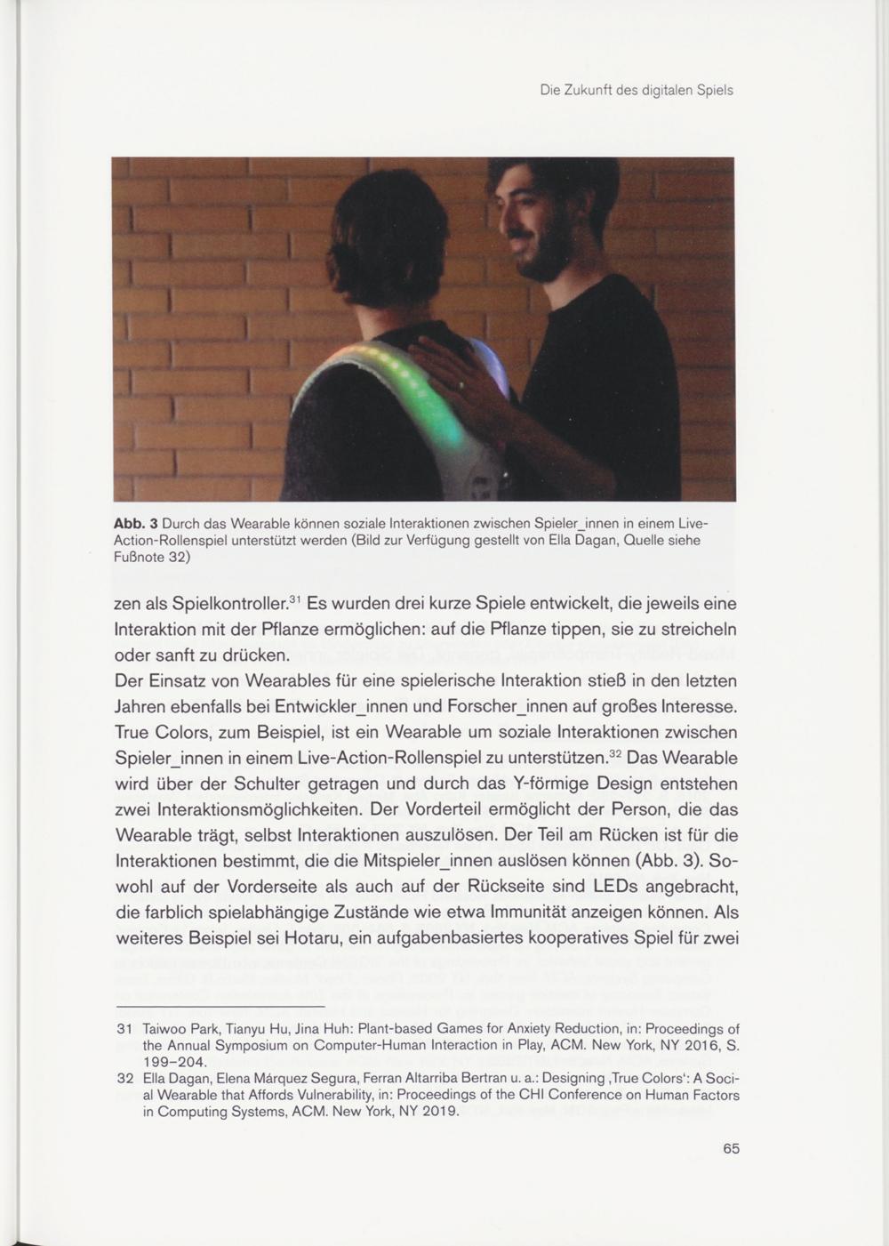 Der Einsatz von Wearables für eine spielerische Interaktion stieß in den letzten Jahren ebenfalls bei Entwicklerjnnen und Forscherjnnen auf großes Interesse. True Colors, zum Beispiel, ist ein Wearable um soziale Interaktionen zwischen Spielerjnnen in einem Live-Action-Rollenspiel zu unterstützen. 32 Das Wearable wird über der Schulter getragen und durch das Y-förmige Design entstehen zwei Interaktionsmöglichkeiten. Der Vorderteil ermöglicht der Person, die das Wearable trägt, selbst Interaktionen auszulösen. Der Teil am Rücken ist für die Interaktionen bestimmt, die die Mitspielerjnnen auslösen können (Abb. 3). Sowohl auf der Vorderseite als auch auf der Rückseite sind LEDs angebracht, die farblich spielabhängige Zustände wie etwa Immunität anzeigen können. Als weiteres Beispiel sei Hotaru, ein aufgabenbasiertes kooperatives Spiel für zwei