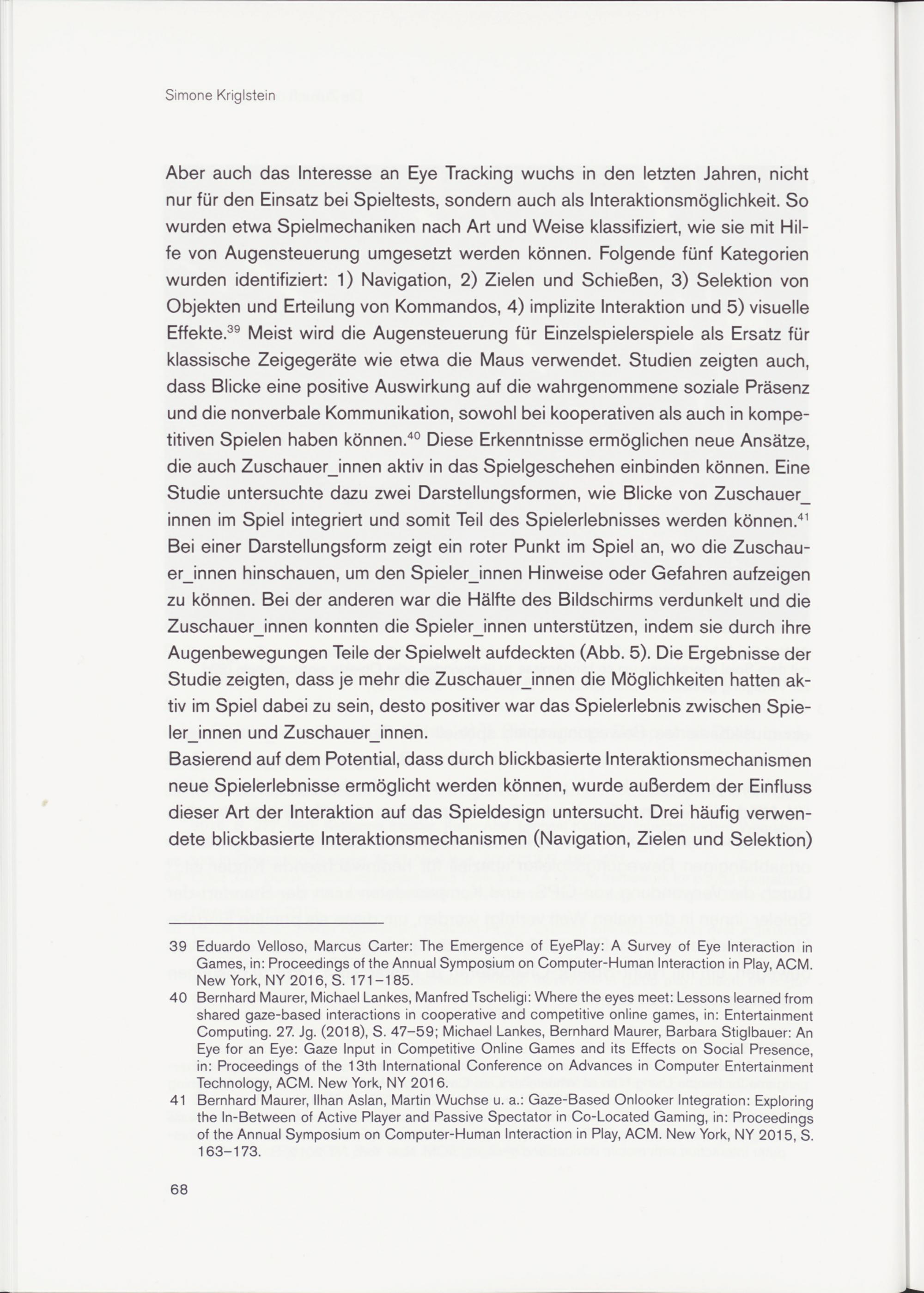 39 Eduardo Velloso, Marcus Carter: The Emergence of EyePlay: A Survey of Eye Interaction in Games, in: Proceedings of the Annual Symposium on Computer-Human Interaction in Play, ACM. New York, NY 2016, S. 171-185.