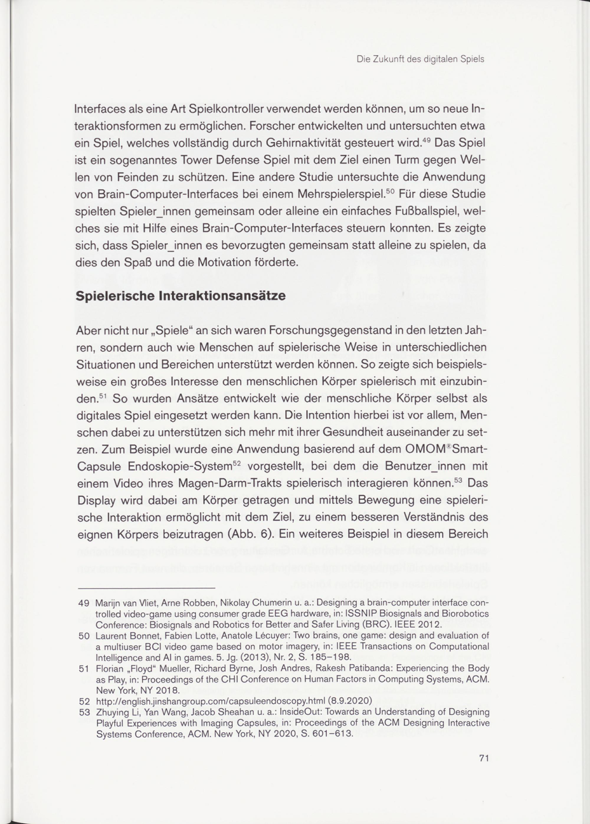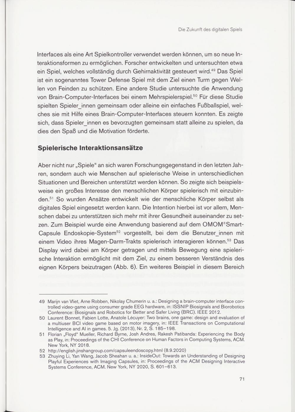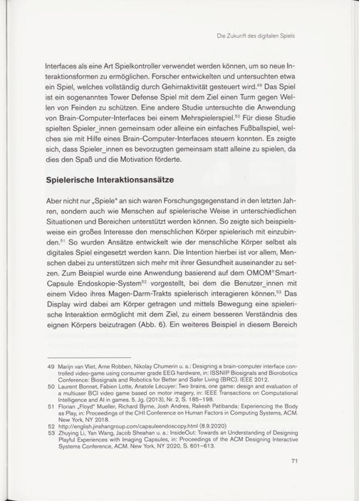 Interfaces als eine Art Spielkontroller verwendet werden können, um so neue Interaktionsformen zu ermöglichen. Forscher entwickelten und untersuchten etwa ein Spiel, welches vollständig durch Gehirnaktivität gesteuert wird. 49 Das Spiel ist ein sogenanntes Tower Defense Spiel mit dem Ziel einen Turm gegen Wellen von Feinden zu schützen. Eine andere Studie untersuchte die Anwendung von Brain-Computer-Interfaces bei einem Mehrspielerspiel. 50 Für diese Studie spielten Spielerjnnen gemeinsam oder alleine ein einfaches Fußballspiel, welches sie mit Hilfe eines Brain-Computer-Interfaces steuern konnten. Es zeigte sich, dass Spielerjnnen es bevorzugten gemeinsam statt alleine zu spielen, da dies den Spaß und die Motivation förderte.
