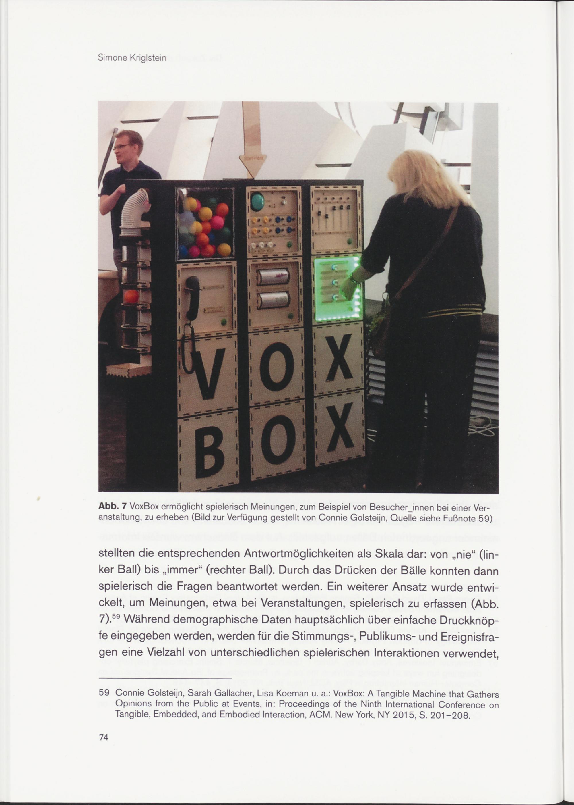 59 Connie Golsteijn, Sarah Gallacher, Lisa Koeman u. a.: VoxBox: A Tangible Machine that Gathers Opinions from the Public at Events, in: Proceedings of the Ninth International Conference on Tangible, Embedded, and Embodied Interaction, ACM. New York, NY 2015, S. 201-208.