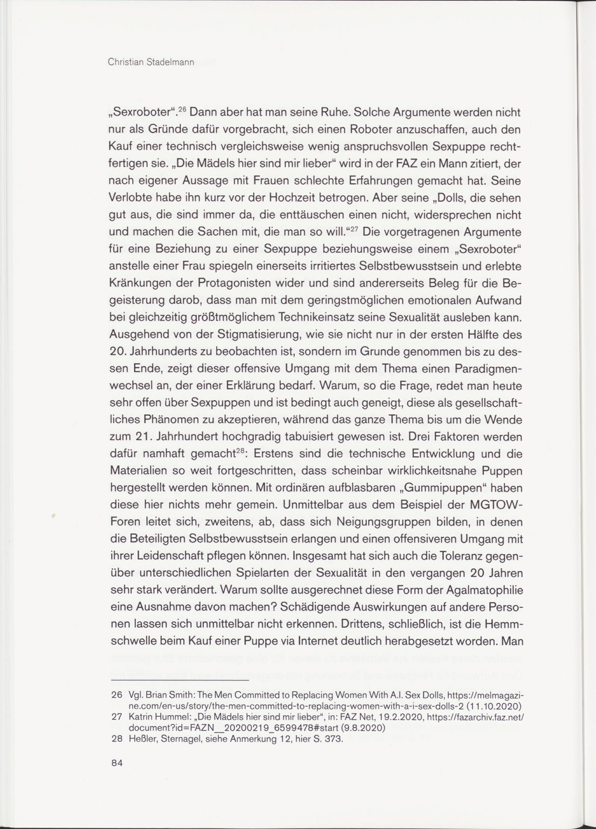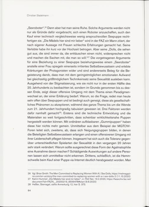 „Sexroboter“. 26 Dann aber hat man seine Ruhe. Solche Argumente werden nicht nur als Gründe dafür vorgebracht, sich einen Roboter anzuschaffen, auch den Kauf einer technisch vergleichsweise wenig anspruchsvollen Sexpuppe recht- fertigen sie. „Die Mädels hier sind mir lieber“ wird in der FAZ ein Mann zitiert, der nach eigener Aussage mit Frauen schlechte Erfahrungen gemacht hat. Seine Verlobte habe ihn kurz vor der Hochzeit betrogen. Aber seine „Dolls, die sehen gut aus, die sind immer da, die enttäuschen einen nicht, widersprechen nicht und machen die Sachen mit, die man so will.“ 27 Die vorgetragenen Argumente für eine Beziehung zu einer Sexpuppe beziehungsweise einem „Sexroboter“ anstelle einer Frau spiegeln einerseits irritiertes Selbstbewusstsein und erlebte Kränkungen der Protagonisten wider und sind andererseits Beleg für die Begeisterung darob, dass man mit dem geringstmöglichen emotionalen Aufwand bei gleichzeitig größtmöglichem Technikeinsatz seine Sexualität ausleben kann. Ausgehend von der Stigmatisierung, wie sie nicht nur in der ersten Hälfte des 20. Jahrhunderts zu beobachten ist, sondern im Grunde genommen bis zu dessen Ende, zeigt dieser offensive Umgang mit dem Thema einen Paradigmenwechsel an, der einer Erklärung bedarf. Warum, so die Frage, redet man heute sehr offen über Sexpuppen und ist bedingt auch geneigt, diese als gesellschaftliches Phänomen zu akzeptieren, während das ganze Thema bis um die Wende zum 21. Jahrhundert hochgradig tabuisiert gewesen ist. Drei Faktoren werden dafür namhaft gemacht 28 : Erstens sind die technische Entwicklung und die Materialien so weit fortgeschritten, dass scheinbar wirklichkeitsnahe Puppen hergestellt werden können. Mit ordinären aufblasbaren „Gummipuppen“ haben diese hier nichts mehr gemein. Unmittelbar aus dem Beispiel der MGTOW- Foren leitet sich, zweitens, ab, dass sich Neigungsgruppen bilden, in denen die Beteiligten Selbstbewusstsein erlangen und einen offensiveren Umgang mit ihrer Leidenschaft pflegen können. Insgesamt hat sich auch die Toleranz gegenüber unterschiedlichen Spielarten der Sexualität in den vergangen 20 Jahren sehr stark verändert. Warum sollte ausgerechnet diese Form der Agalmatophilie eine Ausnahme davon machen? Schädigende Auswirkungen auf andere Personen lassen sich unmittelbar nicht erkennen. Drittens, schließlich, ist die Hemmschwelle beim Kauf einer Puppe via Internet deutlich herabgesetzt worden. Man