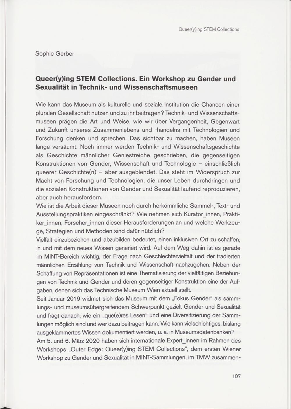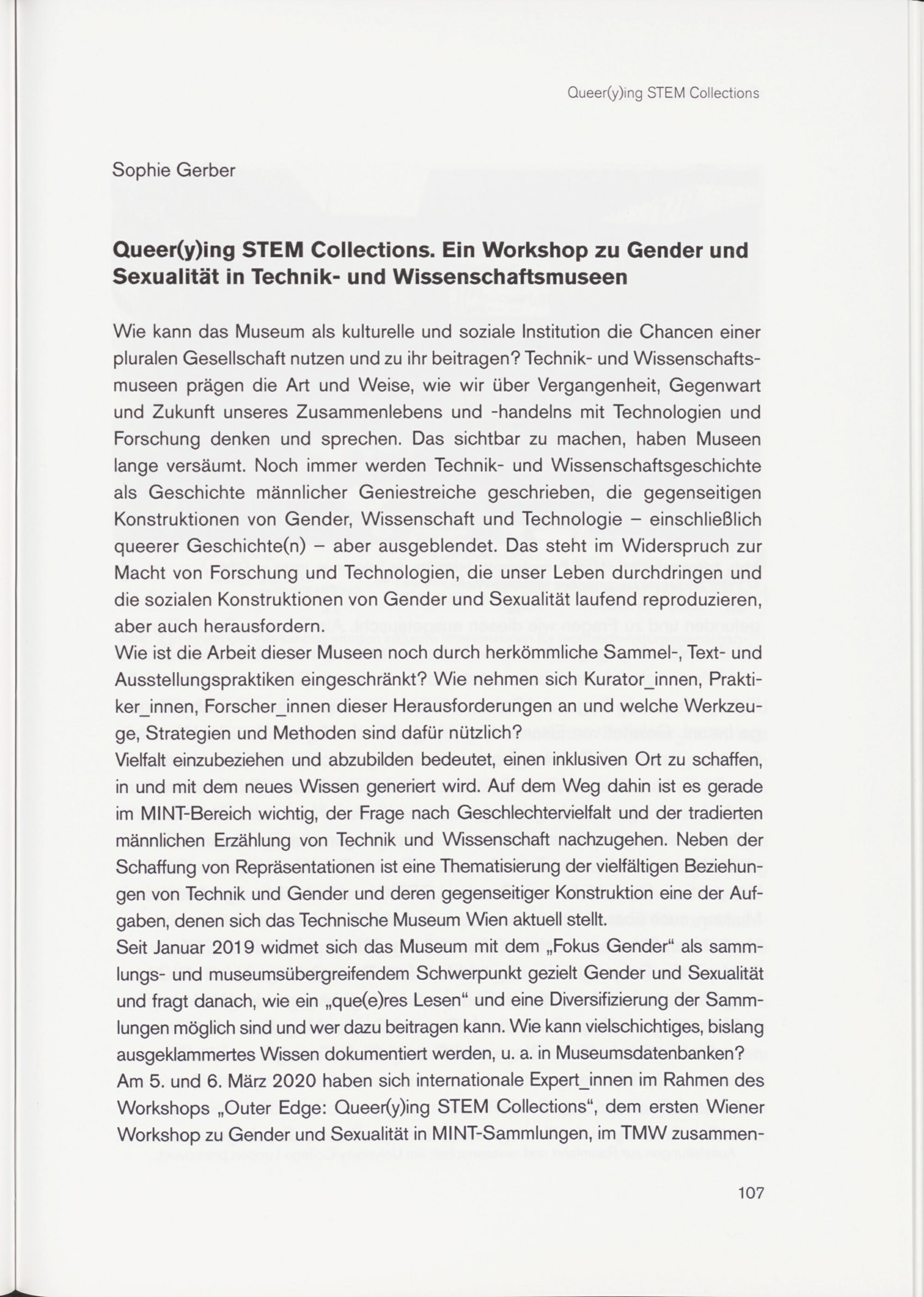 Wie kann das Museum als kulturelle und soziale Institution die Chancen einer pluralen Gesellschaft nutzen und zu ihr beitragen? Technik- und Wissenschaftsmuseen prägen die Art und Weise, wie wir über Vergangenheit, Gegenwart und Zukunft unseres Zusammenlebens und -handelns mit Technologien und Forschung denken und sprechen. Das sichtbar zu machen, haben Museen lange versäumt. Noch immer werden Technik- und Wissenschaftsgeschichte als Geschichte männlicher Geniestreiche geschrieben, die gegenseitigen Konstruktionen von Gender, Wissenschaft und Technologie - einschließlich queerer Geschichte(n) - aber ausgeblendet. Das steht im Widerspruch zur Macht von Forschung und Technologien, die unser Leben durchdringen und die sozialen Konstruktionen von Gender und Sexualität laufend reproduzieren, aber auch herausfordern.