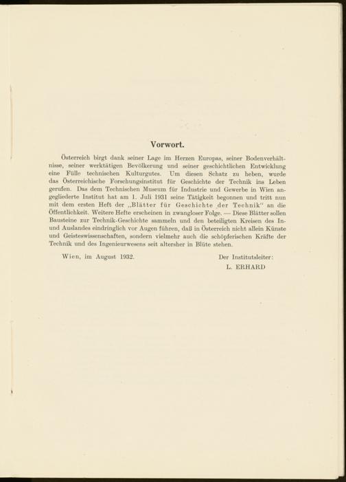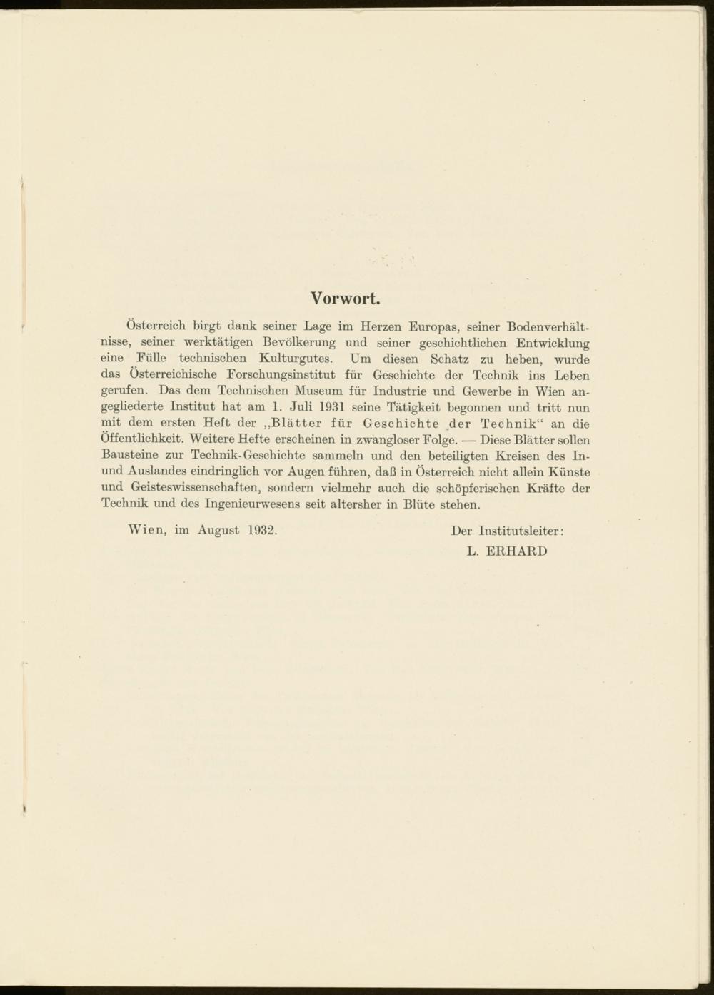 Österreich birgt dank seiner Lage im Herzen Europas, seiner Bodenverhältnisse, seiner werktätigen Bevölkerung und seiner geschichtlichen Entwicklung eine Fülle technischen Kulturgutes. Um diesen Schatz zu heben, wurde das Österreichische Forschungsinstitut für Geschichte der Technik ins Leben gerufen. Das dem Technischen Museum für Industrie und Gewerbe in Wien angegliederte Institut hat am 1. Juli 1931 seine Tätigkeit begonnen und tritt nun mit dem ersten Heft der „Blätter für Geschichte der Technik“ an die Öffentlichkeit. Weitere Hefte erscheinen in zwangloser Folge. — Diese Blätter sollen Bausteine zur Technik-Geschichte sammeln und den beteiligten Kreisen des In- und Auslandes eindringlich vor Augen führen, daß in Österreich nicht allein Künste und Geisteswissenschaften, sondern vielmehr auch die schöpferischen Kräfte der Technik und des Ingenieurwesens seit altersher in Blüte stehen.