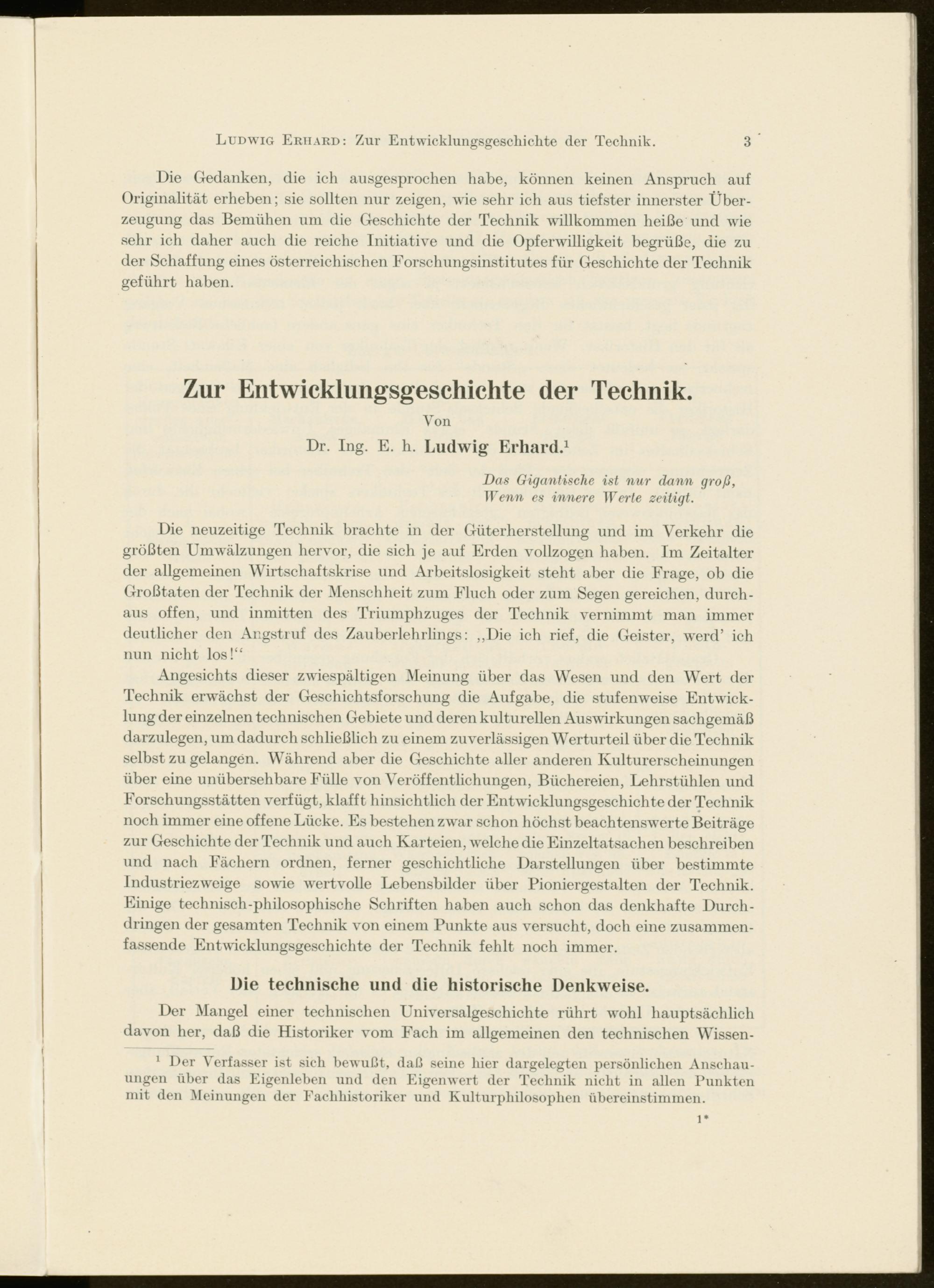 Angesichts dieser zwiespältigen Meinung über das Wesen und den Wert der Technik erwächst der Geschichtsforschung die Aufgabe, die stufenweise Entwicklung der einzelnen technischen Gebiete und deren kulturellen Auswirkungen sachgemäß darzulegen, um dadurch schließlich zu einem zuverlässigen Werturteil über die Technik selbst zu gelangen. Während aber die Geschichte aller anderen Kulturerscheinungen über eine unübersehbare Fülle von Veröffentlichungen, Büchereien, Lehrstühlen und Forschungsstätten verfügt, klafft hinsichtlich der Entwicklungsgeschichte der Technik noch immer eine offene Lücke. Es bestehen zw r ar schon höchst beachtenswerte Beiträge zur Geschichte der Technik und auch Karteien, w r elche die Einzeltatsachen beschreiben und nach Fächern ordnen, ferner geschichtliche Darstellungen über bestimmte Industriezweige sowie wertvolle Lebensbilder über Pioniergestalten der Technik. Einige technisch-philosophische Schriften haben auch schon das denkhafte Durchdringen der gesamten Technik von einem Punkte aus versucht, doch eine zusammenfassende Entwicklungsgeschichte der Technik fehlt noch immer.