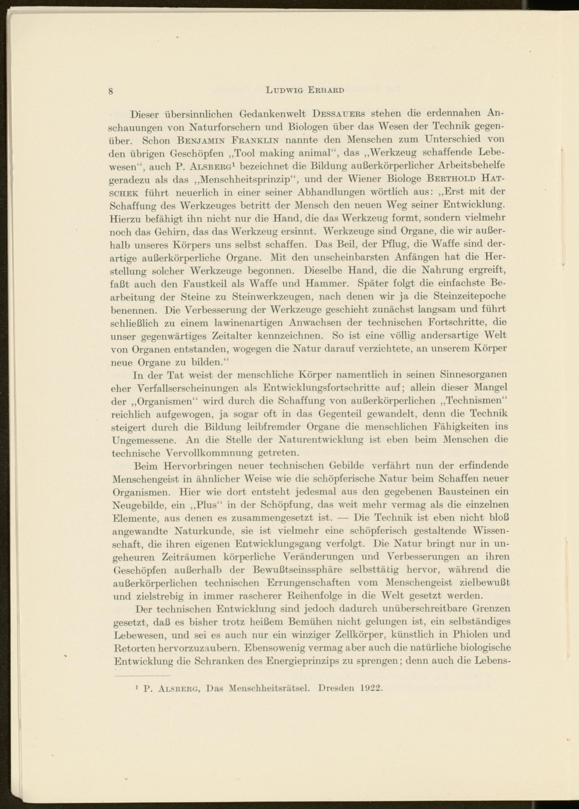 Dieser übersinnlichen Gedankenwelt Dessauers stehen die erdennahen Anschauungen von Naturforschern und Biologen über das Wesen der Technik gegenüber. Schon Benjamin Franklin nannte den Menschen zum Unterschied von den übrigen Geschöpfen „Tool making animal“, das „Werkzeug schaffende Lebewesen“, auch P. Alsberg 1 bezeichnet die Bildung außerkörperlicher Arbeitsbehelfe geradezu als das „Menschheitsprinzip“, und der Wiener Biologe Berthold Hat- schek führt neuerlich in einer seiner Abhandlungen wörtlich aus: „Erst mit der Schaffung des Werkzeuges betritt der Mensch den neuen Weg seiner Entwicklung. Hierzu befähigt ihn nicht nur die Hand, die das Werkzeug formt, sondern vielmehr noch das Gehirn, das das Werkzeug ersinnt. Werkzeuge sind Organe, die wir außerhalb unseres Körpers uns selbst schaffen. Das Beil, der Pflug, die Waffe sind derartige außerkörperliche Organe. Mit den unscheinbarsten Anfängen hat die Herstellung solcher Werkzeuge begonnen. Dieselbe Hand, die die Nahrung ergreift, faßt auch den Faustkeil als Waffe und Hammer. Später folgt die einfachste Bearbeitung der Steine zu Steinwerkzeugen, nach denen wir ja die Steinzeitepoche benennen. Die Verbesserung der Werkzeuge geschieht zunächst langsam und führt schließlich zu einem lawinenartigen Anwachsen der technischen Fortschritte, die unser gegenwärtiges Zeitalter kennzeichnen. So ist eine völlig andersartige Welt von Organen entstanden, wogegen die Natur darauf verzichtete, an unserem Körper neue Organe zu bilden.“