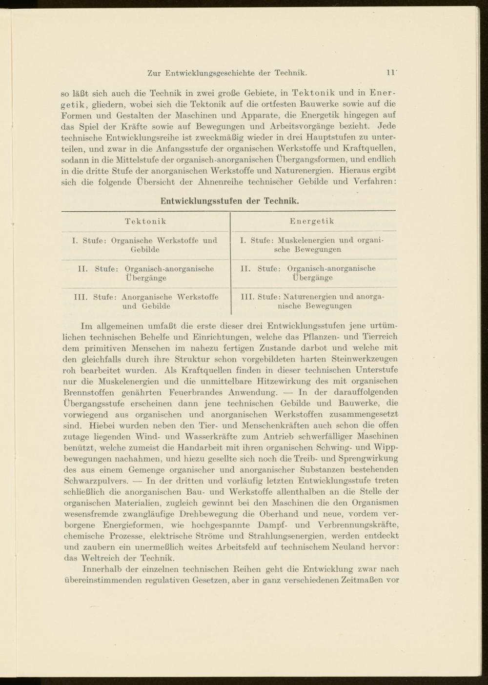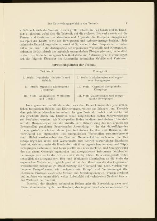 so läßt sich auch die Technik in zwei große Gebiete, in Tektonik und in Energetik, gliedern, wobei sich die Tektonik auf die ortfesten Bauwerke sowie auf die Formen und Gestalten der Maschinen und Apparate, die Energetik hingegen auf das Spiel der Kräfte sowie auf Bewegungen und Arbeitsvorgänge bezieht. Jede technische Entwicklungsreihe ist zweckmäßig wieder in drei Hauptstufen zu unterteilen, und zwar in die Anfangsstufe der organischen Werkstoffe und Kraftquellen, sodann in die Mittelstufe der organisch-anorganischen Übergangsformen, und endlich in die dritte Stufe der anorganischen Werkstoffe und Naturenergien. Hieraus ergibt sich die folgende Übersicht der Ahnenreihe technischer Gebilde und Verfahren:
