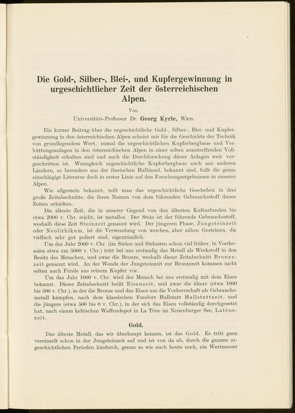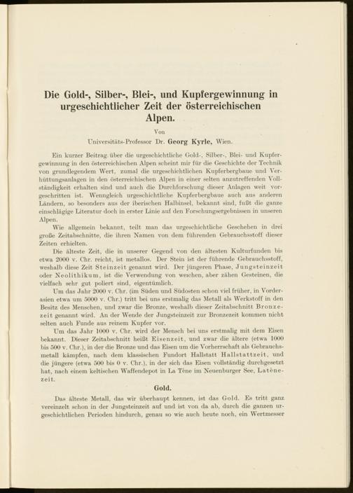 Ein kurzer Beitrag über die urgeschichtliche Gold-, Silber-, Blei- und Kupfergewinnung in den österreichischen Alpen scheint mir für die Geschichte der Technik von grundlegendem Wert, zumal die urgeschichtlichen Kupferbergbaue und Verhüttungsanlagen in den österreichischen Alpen in einer selten anzutreffenden Vollständigkeit erhalten sind und auch die Durchforschung dieser Anlagen weit vor* geschritten ist. Wenngleich urgeschichtliche Kupferberghaue auch aus anderen Ländern, so besonders aus der iberischen Halbinsel, bekannt sind, fußt die ganze einschlägige Literatur doch in erster Linie auf den Forschungsergebnissen in \mseren Alpen.
