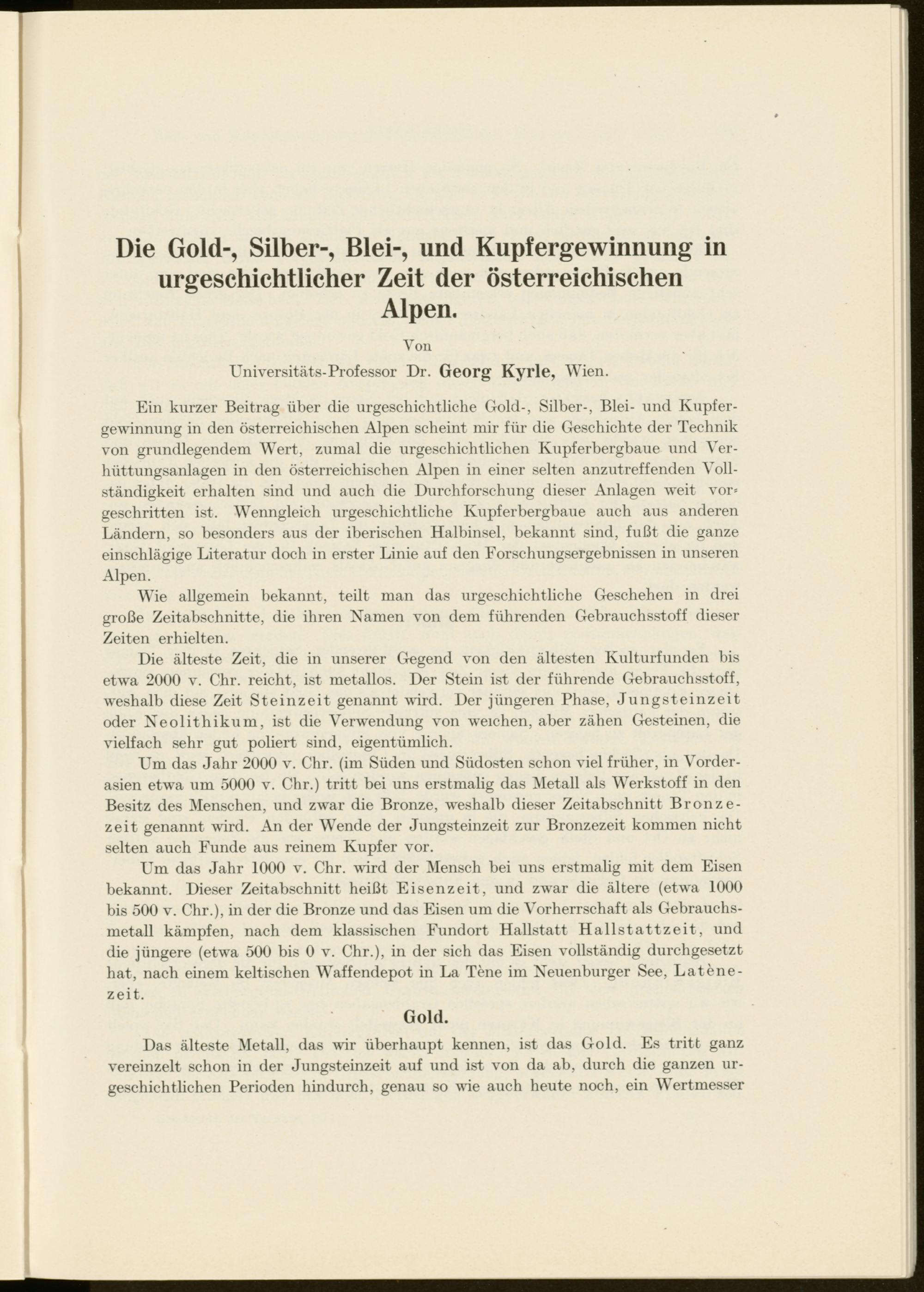 Das älteste Metall, das wir überhaupt kennen, ist das Gold. Es tritt ganz vereinzelt schon in der Jungsteinzeit auf und ist von da ab, durch die ganzen urgeschichtlichen Perioden hindurch, genau so wie auch heute noch, ein Wertmesser