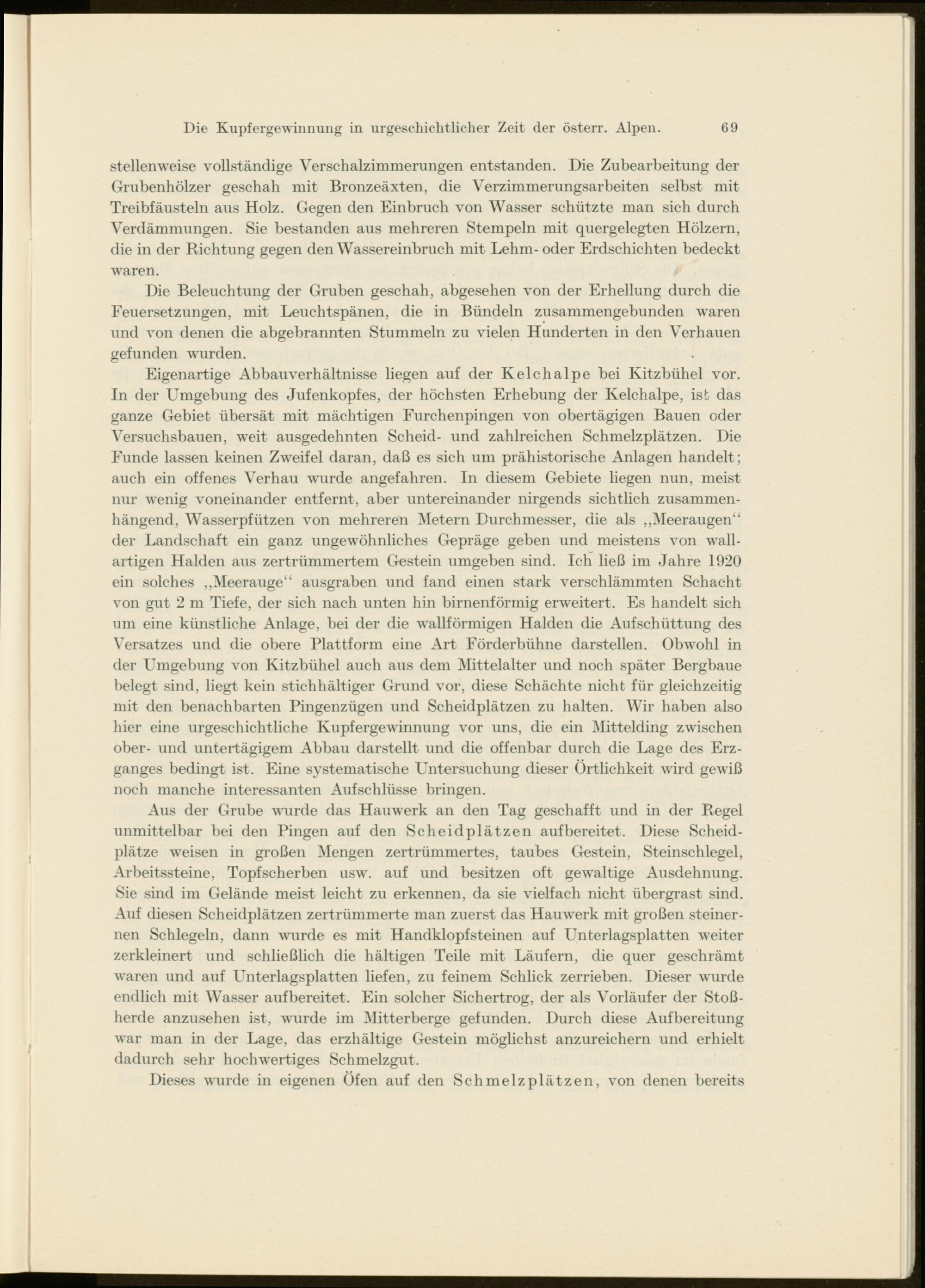 Eigenartige Abbauverhältnisse liegen auf der Kelchalpe bei Kitzbühel vor. In der Umgebung des Jufenkopfes, der höchsten Erhebung der Kelchalpe, ist das ganze Gebiet übersät mit mächtigen Furchenpingen von obertägigen Bauen oder Versuchsbauen, weit ausgedehnten Scheid- und zahlreichen Schmelzplätzen. Die Funde lassen keinen Zweifel daran, daß es sich um prähistorische Anlagen handelt ; auch ein offenes Verhau wurde angefahren. In diesem Gebiete liegen nun, meist nur wenig voneinander entfernt, aber untereinander nirgends sichtlich zusammenhängend, Wasserpfützen von mehreren Metern Durchmesser, die als ,,Meeraugen“ der Landschaft ein ganz ungewöhnliches Gepräge geben und meistens von wallartigen Halden aus zertrümmertem Grestein umgeben sind. Ich ließ im Jahre 1920 ein solches „Meerauge“ ausgraben und fand einen stark verschlämmten Schacht von gut 2 m Tiefe, der sich nach unten hin birnenförmig erweitert. Es handelt sich um eine künstliche Anlage, bei der die wallförmigen Halden die Aufschüttung des Versatzes und die obere Plattform eine Art Eörderbühne darstellen. Obwohl in der Umgebung von Kitzbühel auch aus dem Mittelalter und noch später Bergbaue belegt sind, liegt kein stichhältiger Grund vor, diese Schächte nicht für gleichzeitig mit den benachbarten Pingenzügen und Scheidplätzen zu halten. Wir haben also hier eine urgeschichtliche Kupfergewinnung vor uns, die ein Mittelding zwischen ober- und untertägigem Abbau darstellt und die offenbar durch die Lage des Erzganges bedingt ist. Eine systematische Untersuchung dieser Örtlichkeit wird gewiß noch manche interessanten Aufschlüsse bringen.
