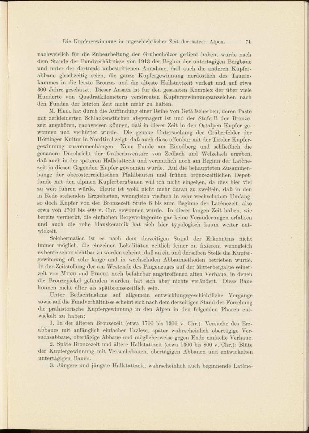 M. Hell hat durch die Auffindung einer Reihe von Gefäßscherben, deren Paste mit zerkleinerten Schlackenstücken abgemagert ist und der Stufe B der Bronzezeit angehören, nachweisen können, daß in dieser Zeit in den Ostalpen Kupfer gewonnen und verhüttet wurde. Die genaue Untersuchung der Gräberfelder der Höttinger Kultur in Nordtirol zeigt, daß auch diese offenbar mit der Tiroler Kupfergewinnung Zusammenhängen. Neue Funde am Einödberg und schließlich die genauere Durchsicht der Gräberinventare von Zedlach und Welzelach ergeben, daß auch in der späteren Hallstattzeit und vermutlich noch am Beginn der Latene- zeit in diesen Gegenden Kupfer gewonnen wurde. Auf die behaupteten Zusammenhänge der oberösterreichischen Pfahlbauten und frühen bronzezeitlichen Depotfunde mit den alpinen Kupferbergbauen will ich nicht eingehen, da dies hier viel zu w r eit führen würde. Heute ist wohl nicht mehr daran zu zweifeln, daß in den in Rede stehenden Erzgebieten, wenngleich vielfach in sehr wechselndem Umfang, so doch Kupfer von der Bronzezeit Stufe B bis zum Beginne der Latenezeit, also etwa von 1700 bis 400 v. Chr. gewonnen wurde. In dieser langen Zeit haben, wie bereits vermerkt, die einfachen Bergwerksgeräte gar keine Veränderungen erfahren und auch die rohe Hauskeramik hat sich hier typologisch kaum weiter entwickelt.