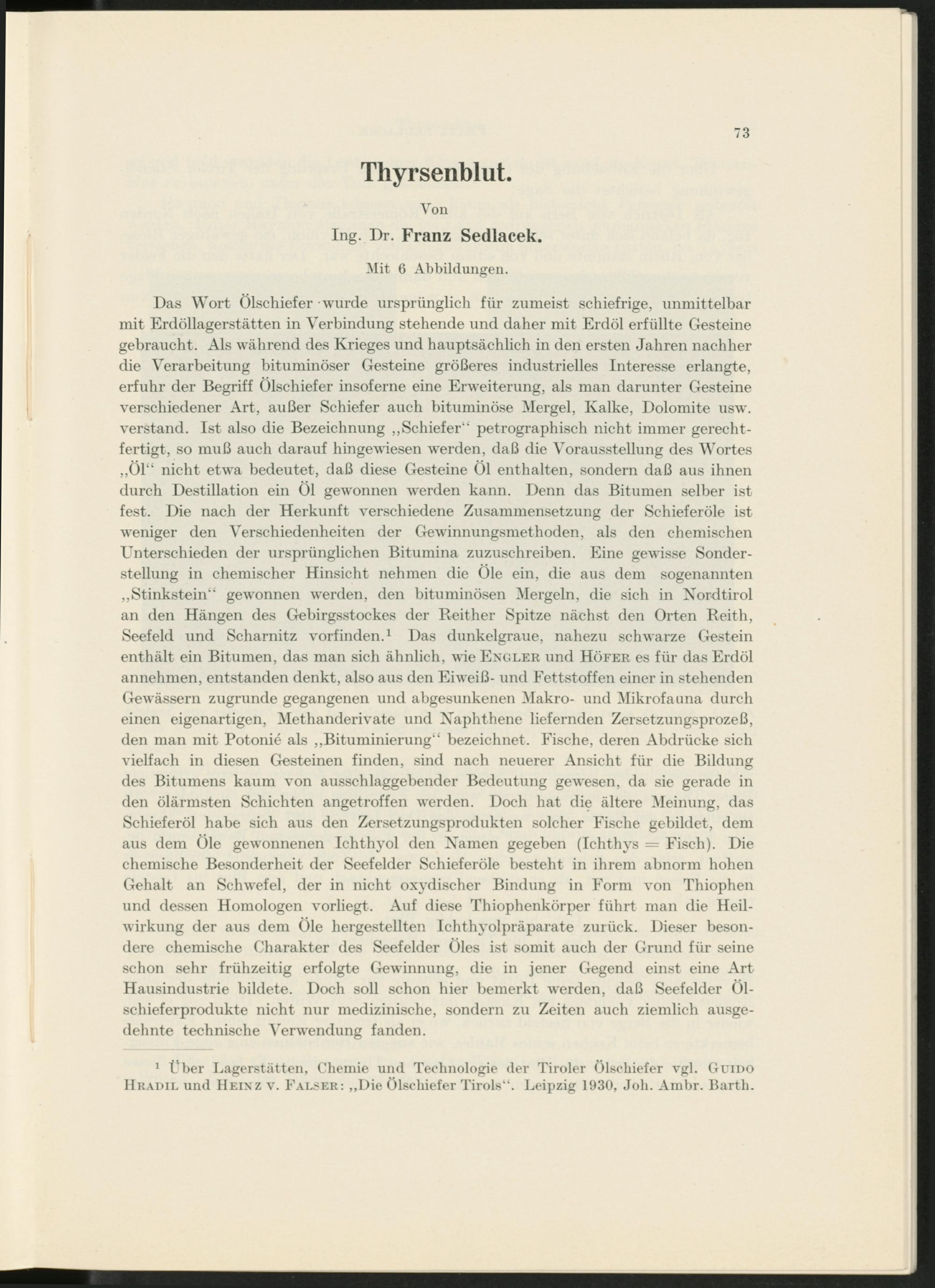 1 Über Lagerstätten, Chemie und Technologie der Tiroler Ölschiefer vgl. Cfumo Hradil und Heinz v. Falser: „Die Ölschiefer Tirols“. Leipzig 1930, Joh. Ainbr. Barth.