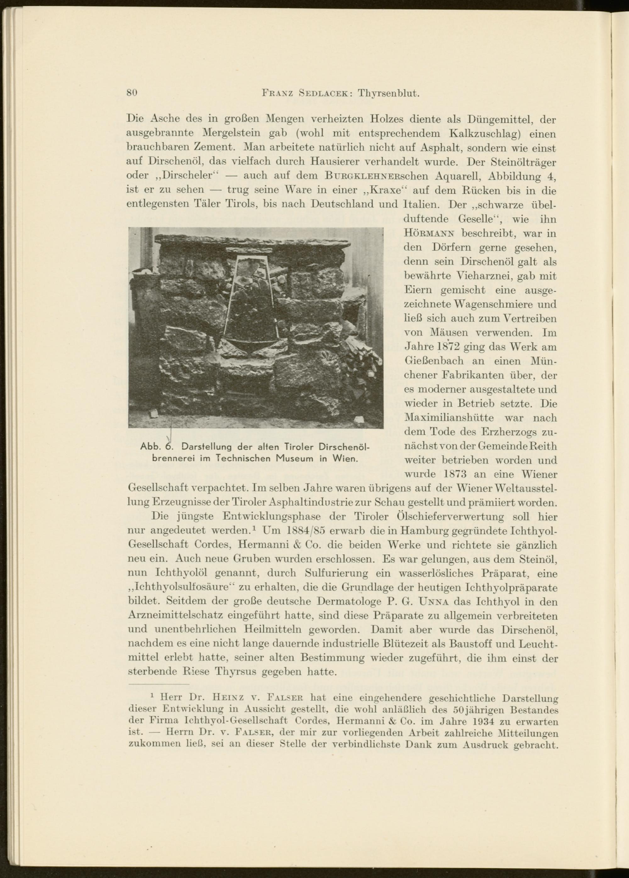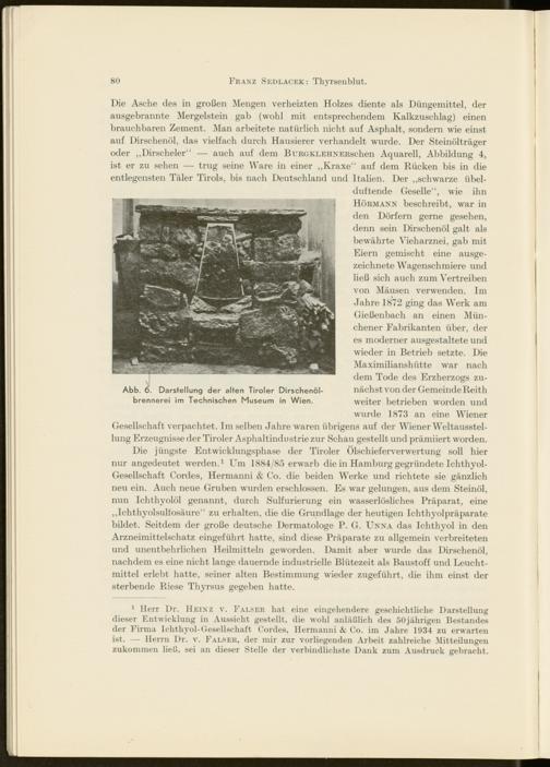Die jüngste Entwicklungsphase der Tiroler Ölschieferverwertung soll hier nur angedeutet werden. 1 Um 1884/85 erwarb die in Hamburg gegründete Ichthyol- Gesellschaft Cordes, Hermanni & Co. die beiden Werke und richtete sie gänzlich neu ein. Auch neue Gruben wurden erschlossen. Es war gelungen, aus dem Steinöl, nun Ichthyolöl genannt, durch Sulfurierung ein wasserlösliches Präparat, eine „Ichthyolsulfosäure“ zu erhalten, die die Grundlage der heutigen Ichthyolpräparate bildet. Seitdem der große deutsche Dermatologe P. G. Unna das Ichthyol in den Arzneimittelschatz eingeführt hatte, sind diese Präparate zu allgemein verbreiteten und unentbehrlichen Heilmitteln geworden. Damit aber wurde das Dirschenöl, nachdem es eine nicht lange dauernde industrielle Blütezeit als Baustoff und Leucht- mittel erlebt hatte, seiner alten Bestimmung wieder zugeführt, die ihm einst der sterbende Riese Thyrsus gegeben hatte.