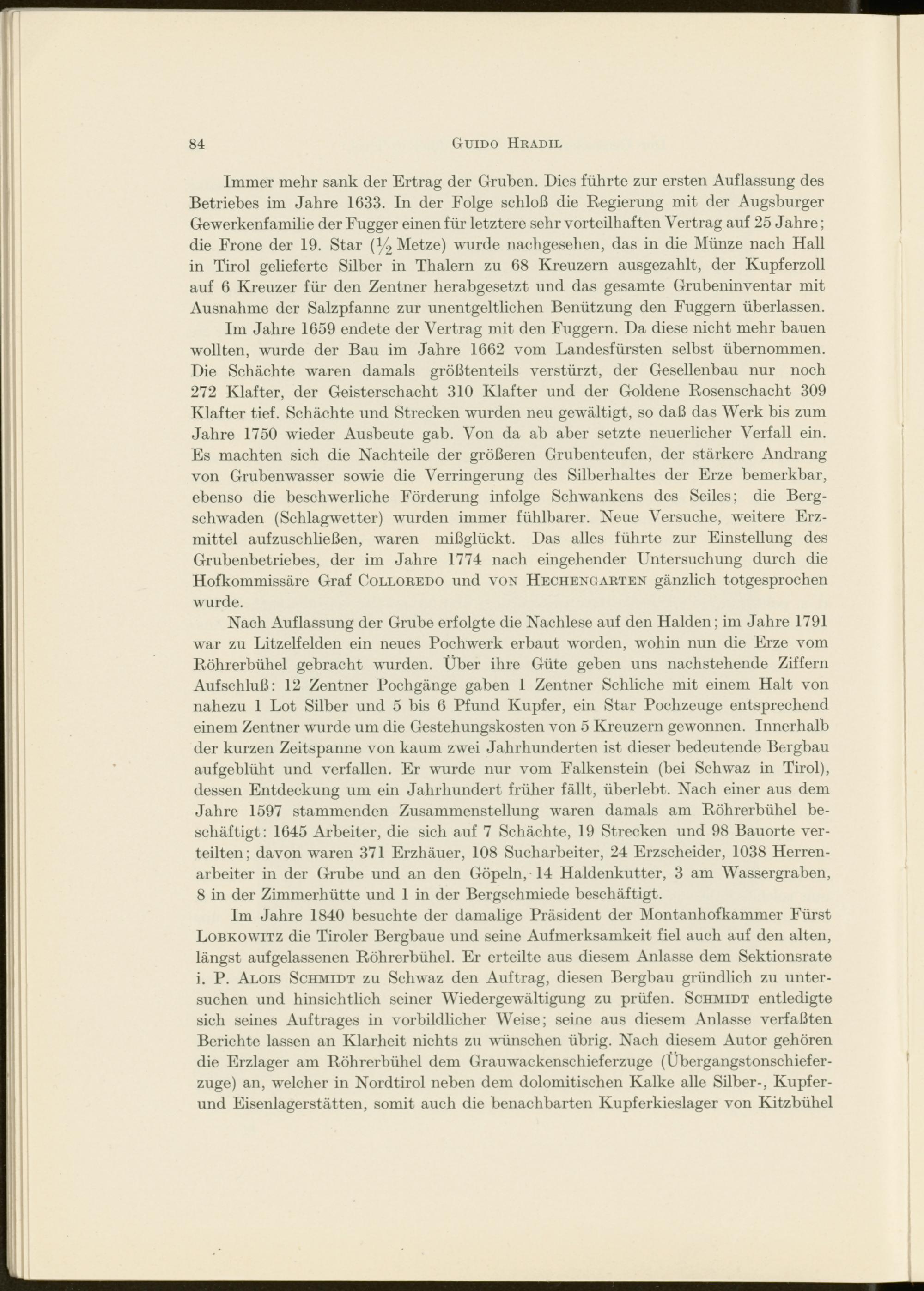 Im Jahre 1840 besuchte der damalige Präsident der Montanhofkammer Fürst Lobkowitz die Tiroler Bergbaue und seine Aufmerksamkeit fiel auch auf den alten, längst aufgelassenen Röhrerbühel. Er erteilte aus diesem Anlasse dem Sektionsrate i. P. Alois Schmidt zu Schwaz den Auftrag, diesen Bergbau gründlich zu untersuchen und hinsichtlich seiner Wiedergewältigung zu prüfen. Schmidt entledigte sich seines Auftrages in vorbildlicher Weise; seine aus diesem Anlasse verfaßten Berichte lassen an Klarheit nichts zu wünschen übrig. Nach diesem Autor gehören die Erzlager am Röhrerbühel dem Gramvackenschieferzuge (Übergangstonschieferzuge) an, welcher in Nordtirol neben dem dolomitischen Kalke alle Silber-, Kupfer- und Eisenlagerstätten, somit auch die benachbarten Kupferkieslager von Kitzbühel