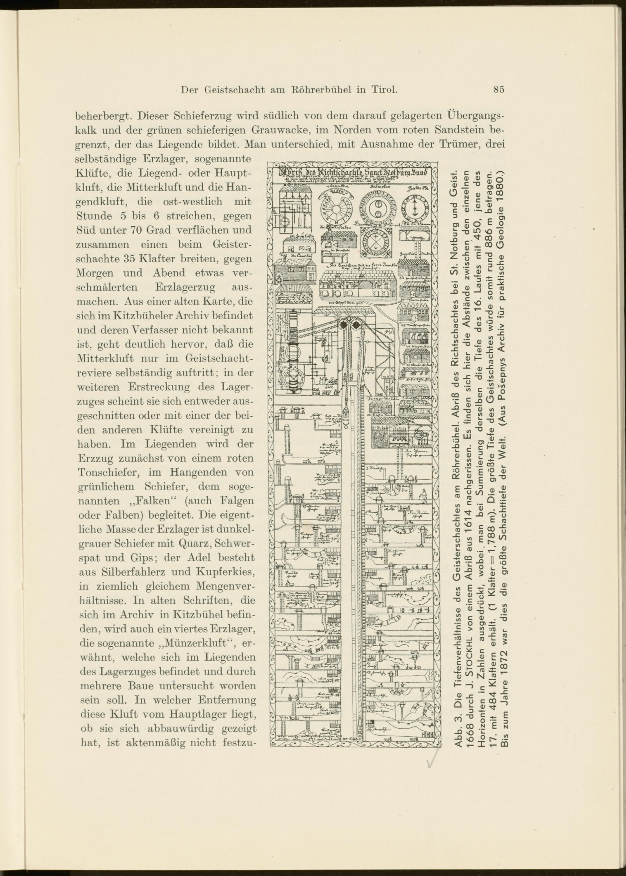 beherbergt. Dieser Schieferzug wird südlich von dem darauf gelagerten Übergangskalk und der grünen schieferigen Grauwacke, im Norden vom roten Sandstein begrenzt, der das Liegende bildet. Man unterschied, mit Ausnahme der Trümer, drei selbständige Erzlager, sogenannte Klüfte, die Liegend- oder Hauptkluft, die Mitterkluft und die Hangendkluft, die ost-westlich mit Stunde 5 bis 6 streichen, gegen Süd unter 70 Grad verflachen und zusammen einen beim Geisterschachte 35 Klafter breiten, gegen Morgen und Abend etwas verschmälerten Erzlagerzug ausmachen. Aus einer alten Karte, die sich im Kitzbüheler Archiv befindet und deren Verfasser nicht bekannt ist, geht deutlich hervor, daß die Mitterkluft nur im Geistschacht- reviere selbständig auftritt; in der weiteren Erstreckung des Lagerzuges scheint sie sich entweder ausgeschnitten oder mit einer der beiden anderen Klüfte vereinigt zu haben. Im Liegenden wird der Erzzug zunächst von einem roten Tonschiefer, im Hangenden von grünlichem Schiefer, dem sogenannten „Falken“ (auch Ealgen oder Falben) begleitet. Die eigentliche Masse der Erzlager ist dunkelgrauer Schiefer mit Quarz, Schwerspat und Gips; der Adel besteht aus Silberfahlerz und Kupferkies, in ziemlich gleichem Mengenverhältnisse. In alten Schriften, die sich im Archiv in Kitzbühel befinden, wird auch ein viertes Erzlager, die sogenannte „Münzerkluft“, erwähnt, welche sich im Liegenden des Lagerzuges befindet und durch mehrere Baue untersucht worden sein soll. In welcher Entfernung diese Kluft vom Hauptlager liegt, ob sie sich abbauwürdig gezeigt hat, ist aktenmäßig nicht festzu-