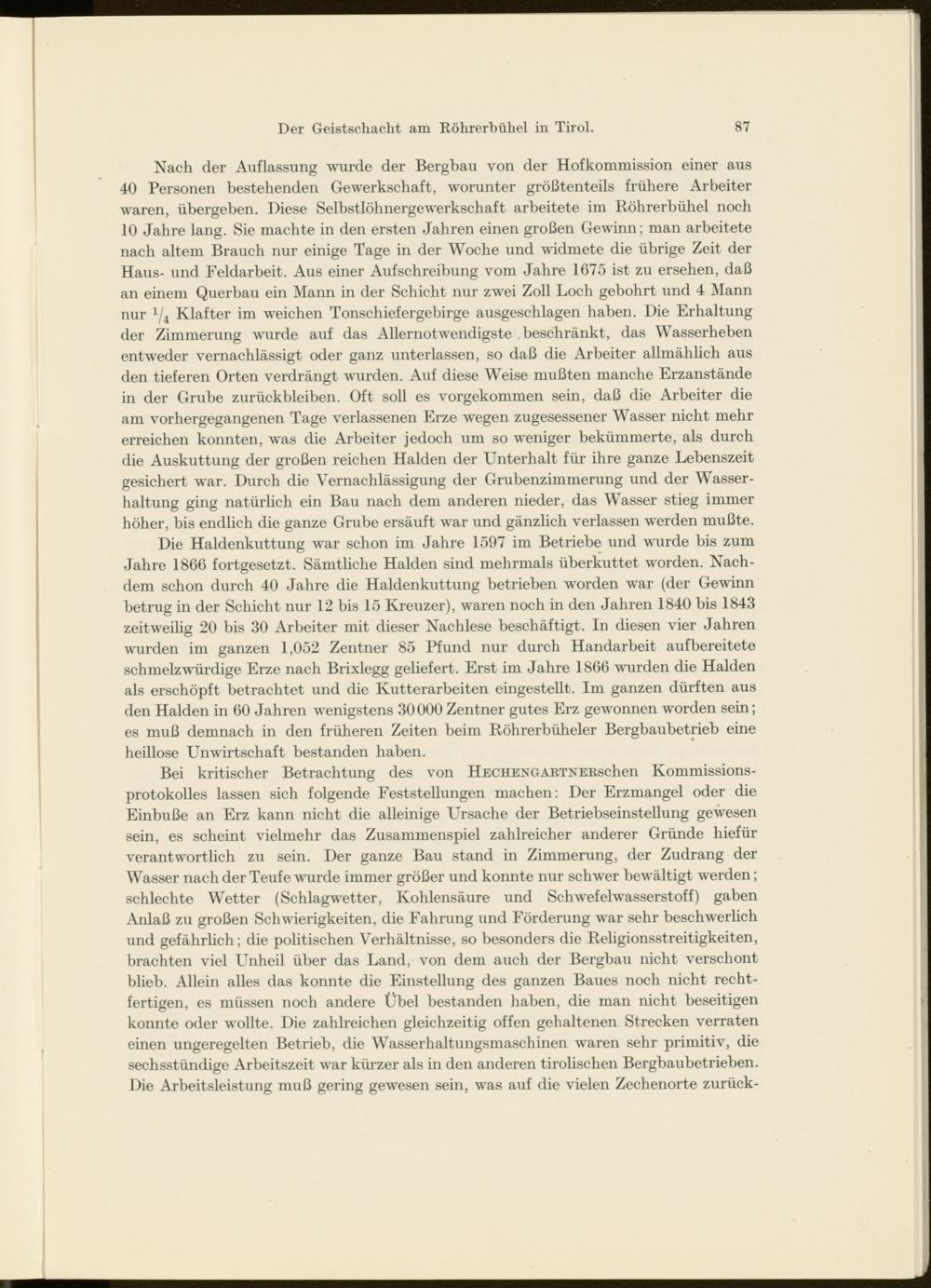 Bei kritischer Betrachtung des von HECHENGARTNERschen Kommissions- protokolles lassen sich folgende Feststellungen machen: Der Erzmangel oder die Einbuße an Erz kann nicht die alleinige Ursache der Betriebseinstellung gewesen sein, es scheint vielmehr das Zusammenspiel zahlreicher anderer Gründe hiefür verantwortlich zu sein. Der ganze Bau stand in Zimmerung, der Zudrang der Wasser nach der Teufe wurde immer größer und konnte mir schwer bewältigt werden; schlechte Wetter (Schlagwetter, Kohlensäure und Schwefelwasserstoff) gaben Anlaß zu großen Schwierigkeiten, die Fahrung und Förderung war sehr beschwerlich und gefährlich; die politischen Verhältnisse, so besonders die Religionsstreitigkeiten, brachten viel Unheil über das Land, von dem auch der Bergbau nicht verschont blieb. Allein alles das konnte die Einstellung des ganzen Baues noch nicht recht- fertigen, es müssen noch andere Übel bestanden haben, die man nicht beseitigen konnte oder wollte. Die zahlreichen gleichzeitig offen gehaltenen Strecken verraten einen ungeregelten Betrieb, die Wasserhaltungsmaschinen waren sehr primitiv, die sechsstündige Arbeitszeit war kürzer als in den anderen tirolischen Bergbaubetrieben. Die Arbeitsleistung muß gering gewesen sein, was auf die vielen Zechenorte zurück-