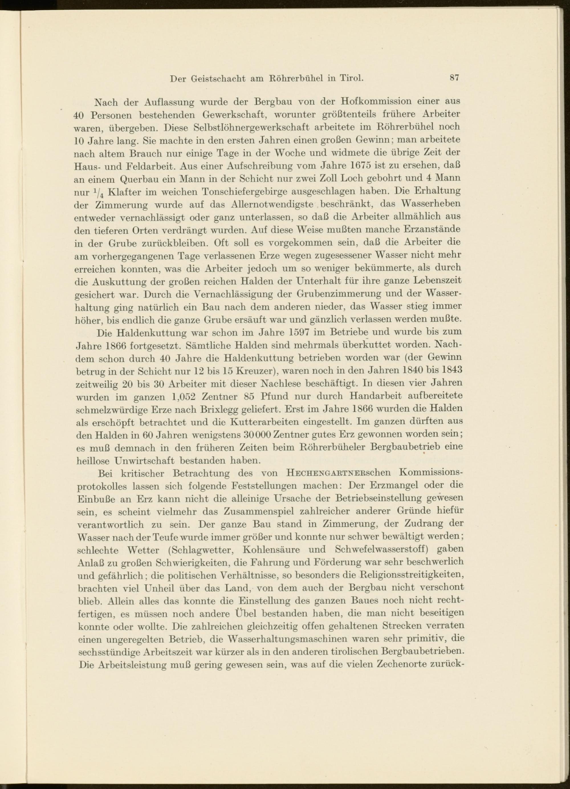 Nach der Auflassung wurde der Bergbau von der Hofkommission einer aus 40 Personen bestehenden Gewerkschaft, worunter größtenteils frühere Arbeiter waren, übergeben. Diese Selbstlöhnergewerkschaft arbeitete im Röhrerbühel noch 10 Jahre lang. Sie machte in den ersten Jahren einen großen Gewann; man arbeitete nach altem Brauch nur einige Tage in der Woche und widmete die übrige Zeit der Haus- und Feldarbeit. Aus einer Aufschreibung vom Jahre 1675 ist zu ersehen, daß an einem Querbau ein Mann in der Schicht nur zwei Zoll Loch gebohrt und 4 Mann nur 1 / 4 Klafter im weichen Tonschiefergebirge ausgeschlagen haben. Die Erhaltung der Zimmerung wurde auf das Allernotwendigste beschränkt, das Wasserheben entweder vernachlässigt oder ganz unterlassen, so daß die Arbeiter allmählich aus den tieferen Orten verdrängt wurden. Auf diese Weise mußten manche Erzanstände in der Grube Zurückbleiben. Oft soll es vorgekommen sein, daß die Arbeiter die am vorhergegangenen Tage verlassenen Erze wegen zugesessener Wasser nicht mehr erreichen konnten, was die Arbeiter jedoch um so weniger bekümmerte, als durch die Auskuttung der großen reichen Halden der Unterhalt für ihre ganze Lebenszeit gesichert w r ar. Durch die Vernachlässigung der Grubenzimmerung und der Wasserhaltung ging natürlich ein Bau nach dem anderen nieder, das Wasser stieg immer höher, bis endlich die ganze Grube ersäuft war und gänzlich verlassen werden mußte.