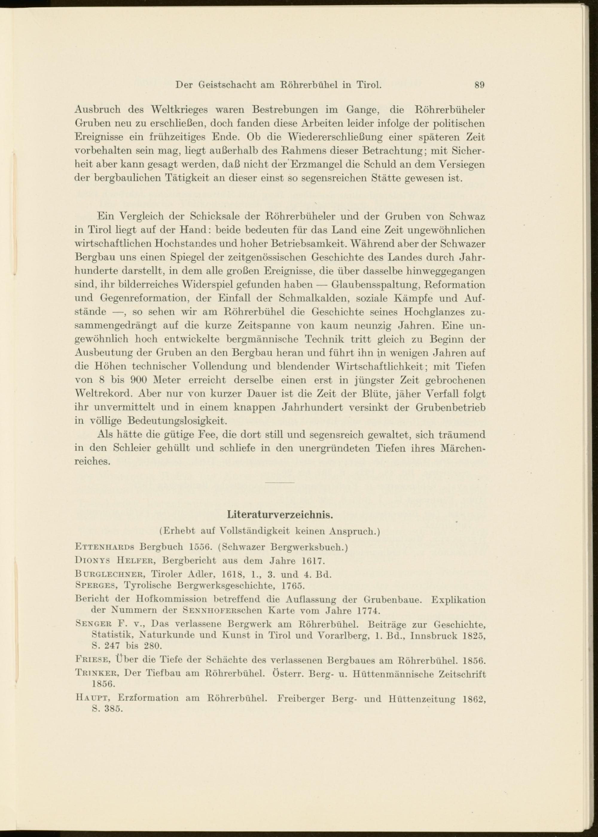 Ein Vergleich der Schicksale der Röhrerbüheler und der Gruben von Schwaz in Tirol liegt auf der Hand: beide bedeuten für das Land eine Zeit ungewöhnlichen wirtschaftlichen Hochstandes und hoher Betriebsamkeit. Während aber der Schwazer Bergbau uns einen Spiegel der zeitgenössischen Geschichte des Landes durch Jahrhunderte darstellt, in dem alle großen Ereignisse, die über dasselbe hinweggegangen sind, ihr bilderreiches Widerspiel gefunden haben — Glaubensspaltung, Reformation und Gegenreformation, der Einfall der Schmalkalden, soziale Kämpfe und Aufstände —, so sehen wir am Röhrerbühel die Geschichte seines Hochglanzes zusammengedrängt auf die kurze Zeitspanne von kaum neunzig Jahren. Eine ungewöhnlich hoch entwickelte bergmännische Technik tritt gleich zu Beginn der Ausbeutung der Gruben an den Bergbau heran und führt ihn in wenigen Jahren auf die Höhen technischer Vollendung und blendender Wirtschaftlichkeit ; mit Tiefen von 8 bis 900 Meter erreicht derselbe einen erst in jüngster Zeit gebrochenen Weltrekord. Aber nur von kurzer Dauer ist die Zeit der Blüte, jäher Verfall folgt ihr unvermittelt und in einem knappen Jahrhundert versinkt der Grubenbetrieb in völlige Bedeutungslosigkeit.