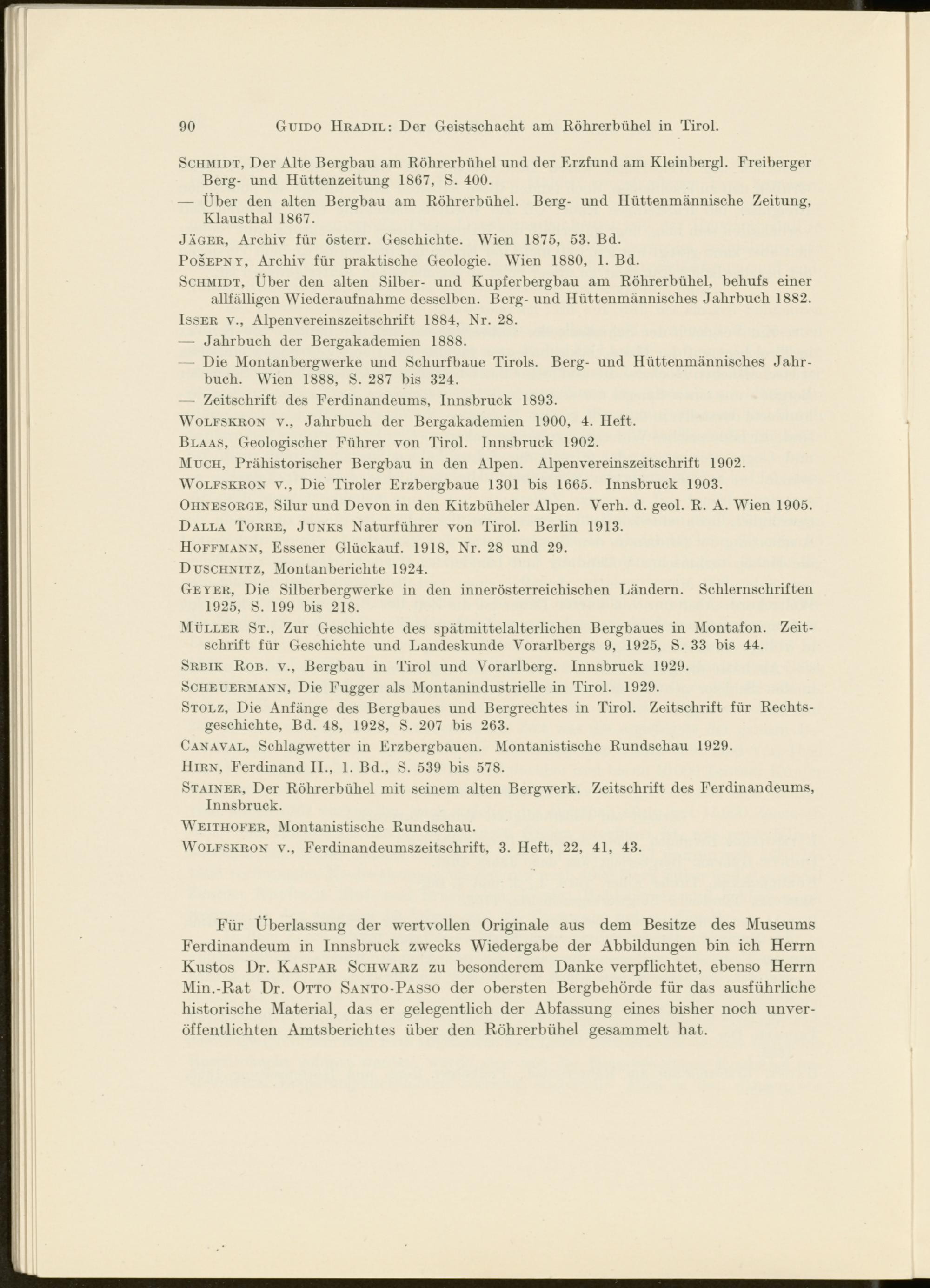 Für Überlassung der wertvollen Originale aus dem Besitze des Museums Ferdinandeum in Innsbruck zwecks Wiedergabe der Abbildungen bin ich Herrn Kustos Dr. Kaspar Schwarz zu besonderem Danke verpflichtet, ebenso Herrn Min.-Rat Dr. Otto Santo-Passo der obersten Bergbehörde für das ausführliche historische Material, das er gelegentlich der Abfassung eines bisher noch unveröffentlichten Amtsberichtes über den Röhrerbühel gesammelt hat.