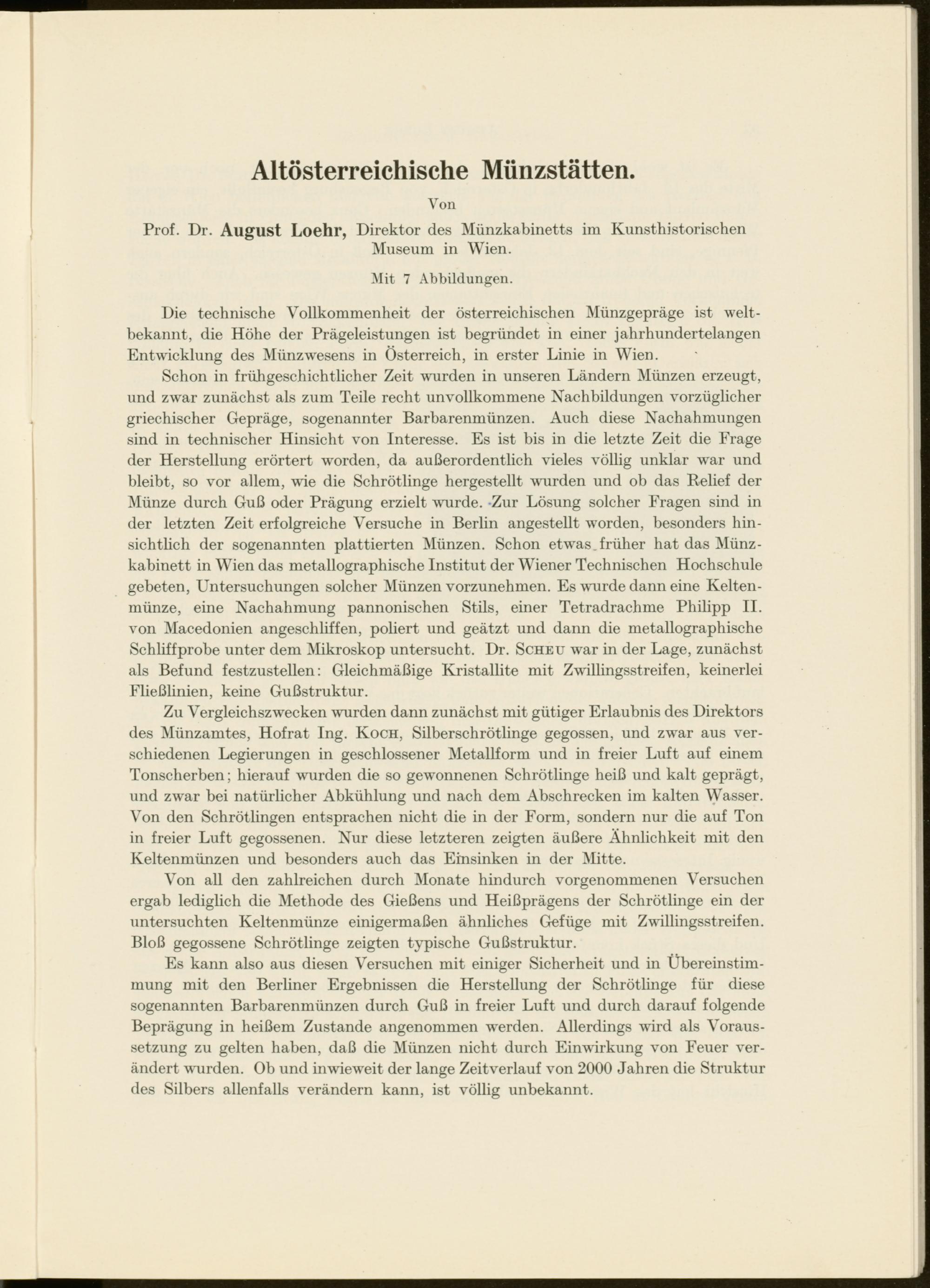 Zu Vergleichszwecken wurden dann zunächst mit gütiger Erlaubnis des Direktors des Münzamtes, Hofrat Ing. Koch, Silberschrötlinge gegossen, und zw r ar aus verschiedenen Legierungen in geschlossener Metallform und in freier Luft auf einem Tonscherben; hierauf wurden die so gewonnenen Schrötlinge heiß und kalt geprägt, und zwar bei natürlicher Abkühlung und nach dem Abschrecken im kalten Wasser. Von den Schrötlingen entsprachen nicht die in der Form, sondern nur die auf Ton in freier Luft gegossenen. Nur diese letzteren zeigten äußere Ähnlichkeit mit den Keltenmünzen und besonders auch das Einsinken in der Mitte.