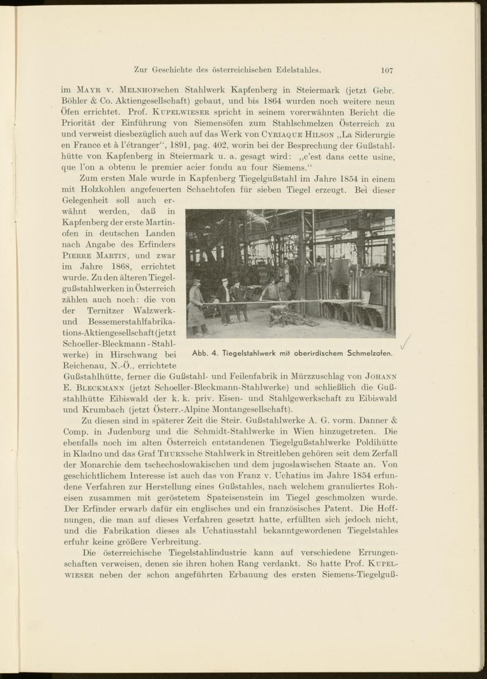 im Mayr v. MELNHOFschen Stahlwerk Kapfenberg in Steiermark (jetzt Gebr. Böhler & Co. Aktiengesellschaft) gebaut, und bis 1864 wurden noch weitere neun Öfen errichtet. Prof. Kupelwieser spricht in seinem vorerwähnten Bericht die Priorität der Einführung von Siemensöfen zum Stahlschmelzen Österreich zu und verweist diesbezüglich auch auf das Werk von Cyriaque Hilson ,,La Siderurgie en France et ä l’etranger“, 1891, pag. 402, worin bei der Besprechung der Gußstahlhütte von Kapfenberg in Steiermark u. a. gesagt wird: „c’est dans cette usine, que Ton a obtenu le premier acier fondu au four Siemens.“