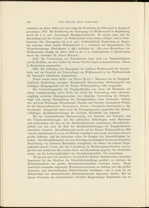 stahlofens im Jahre 1859 auch noch folgende Prioritäten für Österreich in Anspruch genommen: 1871: Die Einführung der Erzeugung von Wolframstahl in Kapfenberg durch die k. k. priv. Innerberger Hauptgewerkschaft. Es scheint aber, daß die Herstellung und der Verkauf von Wolframstahl schon früher erfolgte, weil in Preis- kuranten über Erzeugnisse der k. k. priv. Gußstahlfabrik Kapfenberg zu Beginn der sechziger Jahre bereits Wolframstahl, d. i. Gußstahl mit Diamanthärte, für Schneidwerkzeuge (Drehmesser u. dgl.) enthalten ist. (Die erste Herstellung von Wolframstahl erfolgte im Jahre 1858 in der k. k. Gußstahlhütte in Reichraming durch den Chemiker Dr. Franz Koller.)