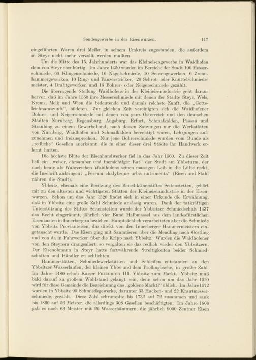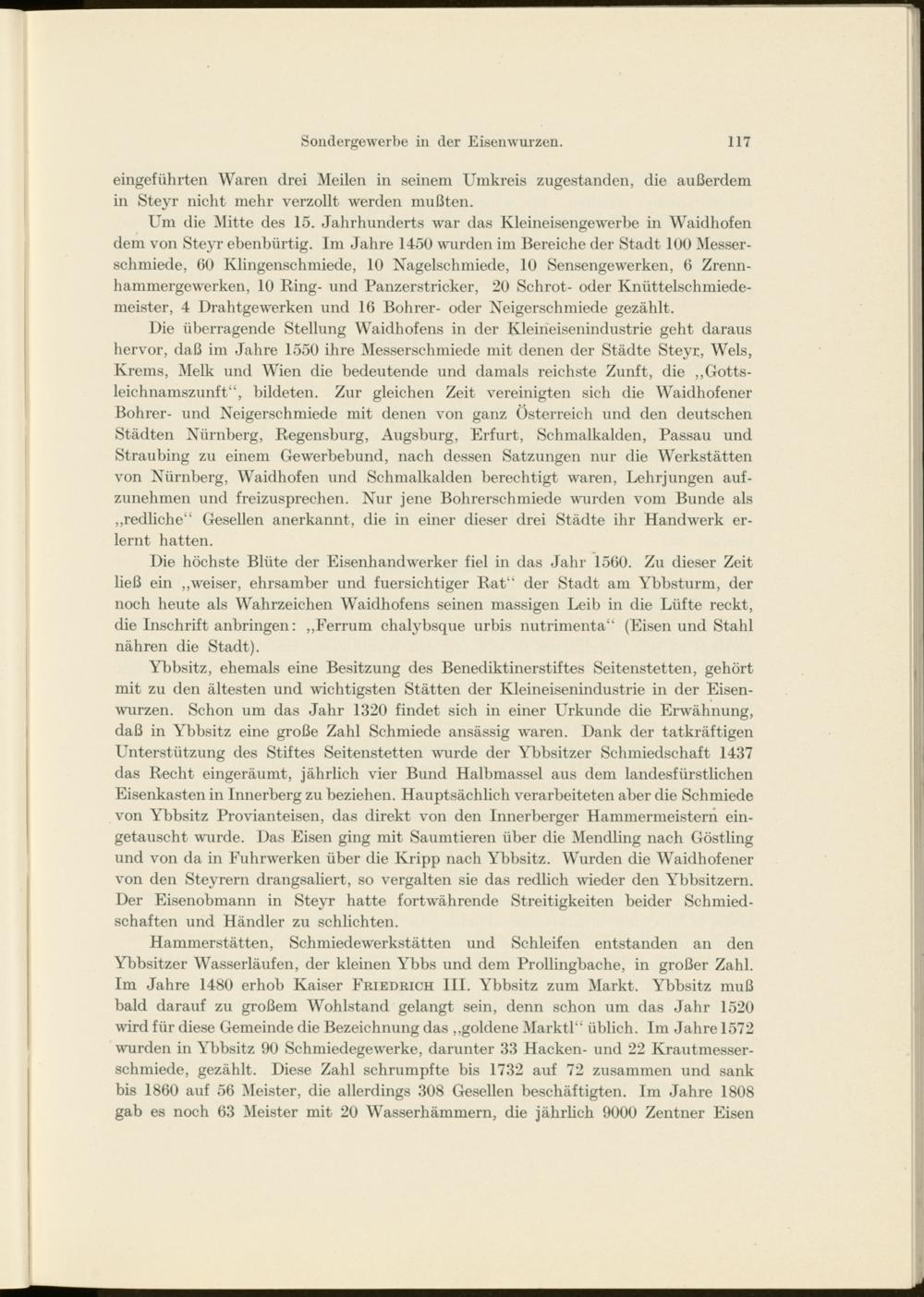 Um die Mitte des 15. Jahrhunderts war das Kleineisengewerbe in Waidhofen dem von Steyr ebenbürtig. Im Jahre 1450 wurden im Bereiche der Stadt 100 Messerschmiede, 00 Klingenschmiede, 10 Nagelschmiede, 10 Sensengewerken, 6 Zrenn- hammergew r erken, 10 Ring- und Panzerstricker, 20 Schrot- oder Knüttelschmiedemeister, 4 Drahtgewerken und 16 Bohrer- oder Neigerschmiede gezählt.