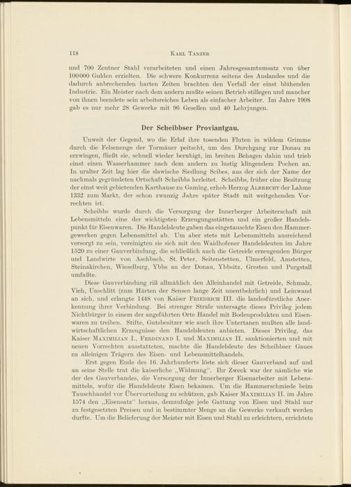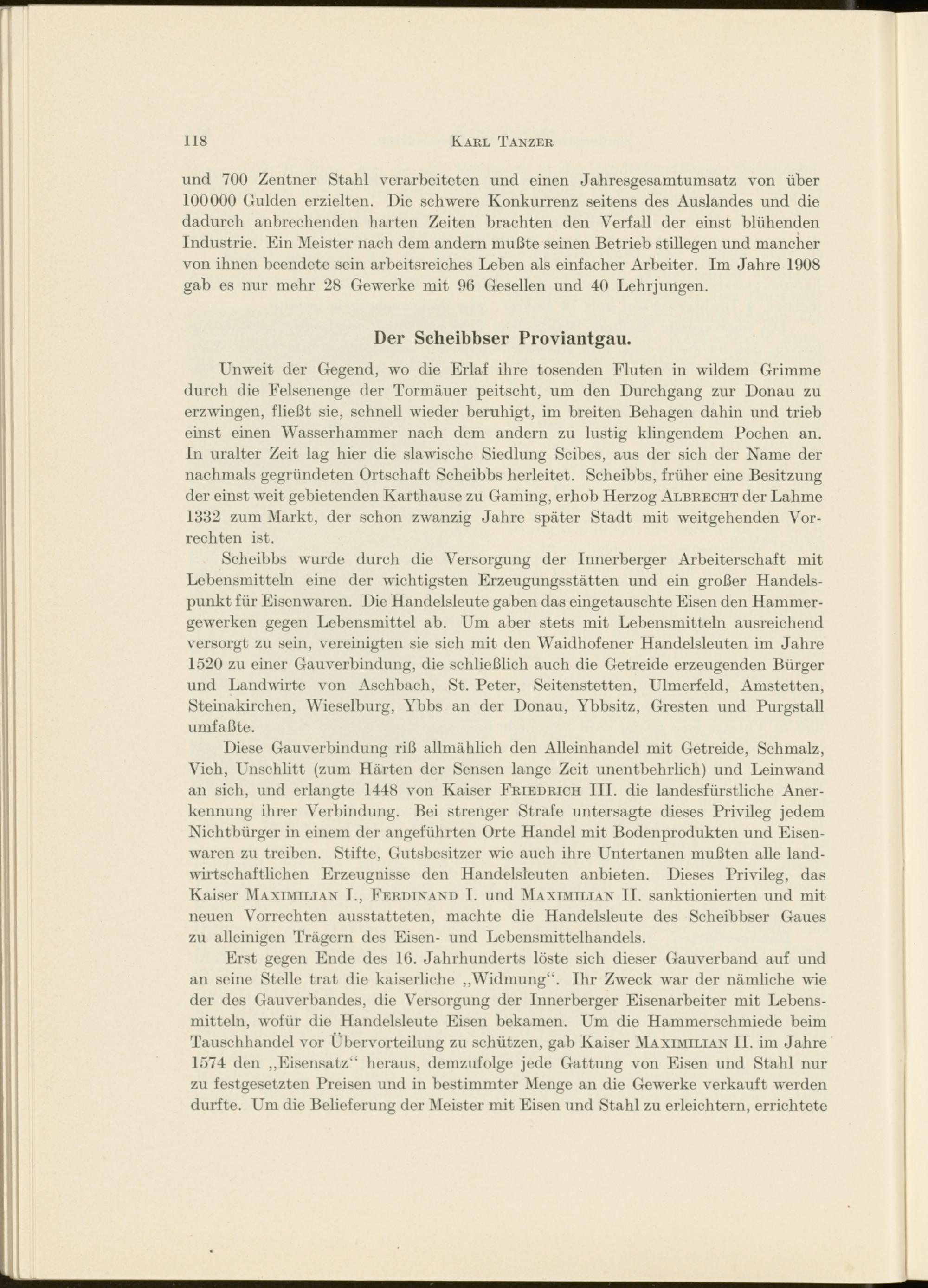 Unweit der Gegend, wo die Erlaf ihre tosenden Fluten in wildem Grimme durch die Eelsenenge der Tormäuer peitscht, um den Durchgang zur Donau zu erzwingen, fließt sie, schnell wieder beruhigt, im breiten Behagen dahin und trieb einst einen Wasserhammer nach dem andern zu lustig klingendem Pochen an. In uralter Zeit lag hier die slawische Siedlung Scibes, aus der sich der Name der nachmals gegründeten Ortschaft Scheibbs herleitet. Scheibbs, früher eine Besitzung der einst weit gebietenden Karthause zu Gaming, erhob Herzog Albrecht der Lahme 1332 zum Markt, der schon zwanzig Jahre später Stadt mit weitgehenden Vorrechten ist.