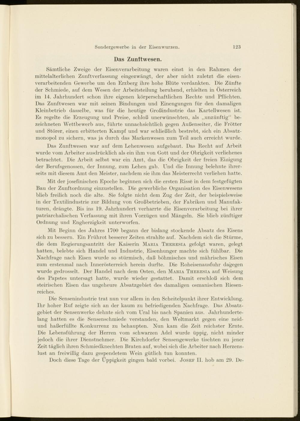 Mit der josefinischen Epoche beginnen sich die ersten Risse in dem festgefügten Bau der Zunftordnung einzustellen. Die gewerbliche Organisation des Eisenwesens blieb freilich noch die alte. Sie folgte nicht dem Zug der Zeit, der beispielsweise in der Textilindustrie zur Bildung von Großbetrieben, der Fabriken und Manufakturen, drängte. Bis ins 19. Jahrhundert verharrte die Eisenverarbeitung bei ihrer patriarchalischen Verfassung mit ihren Vorzügen und Mängeln. Sie blieb zünftiger Ordnung und Engherzigkeit unterwarfen.