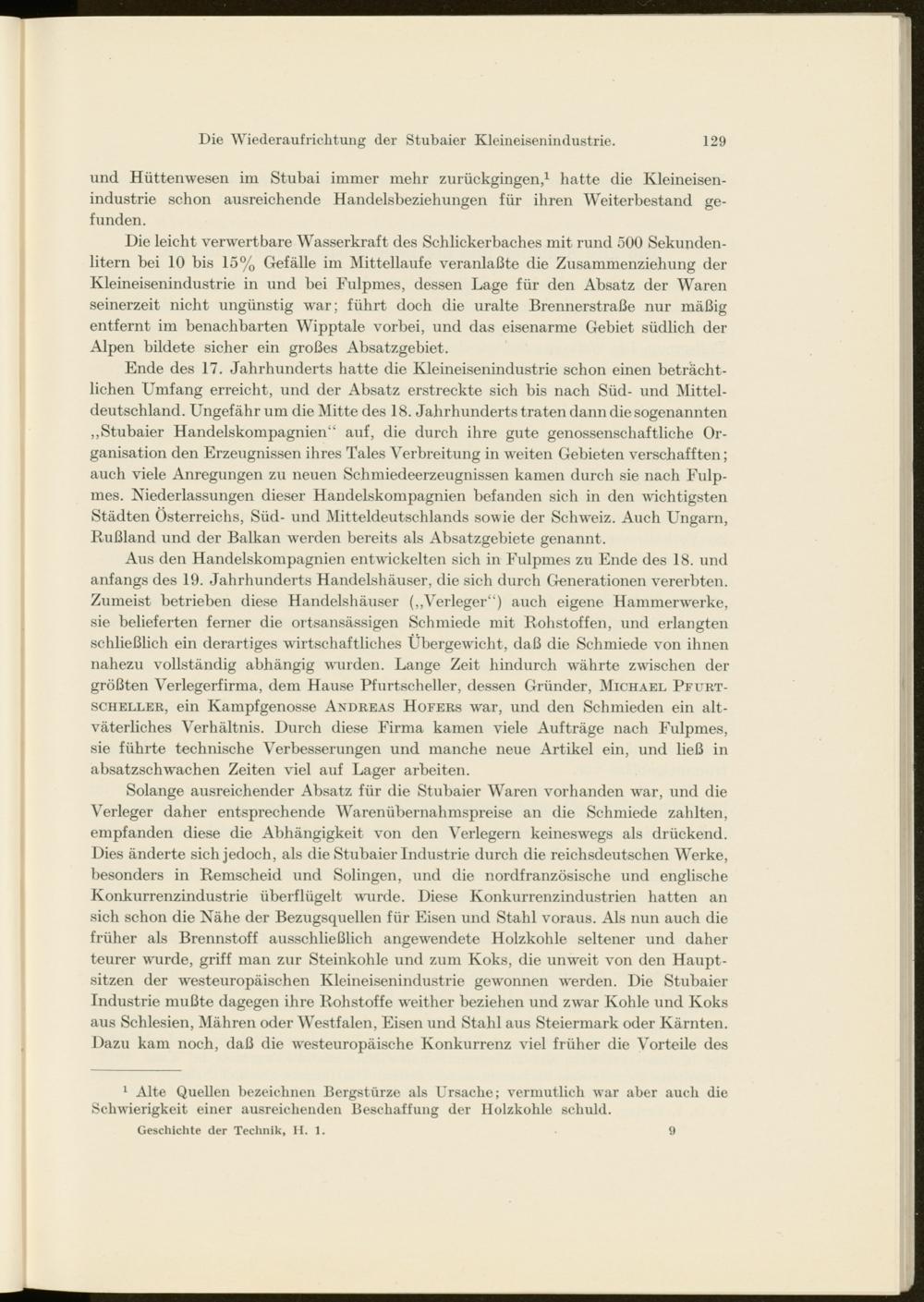 Aus den Handelskompagnien entwickelten sich in Fulpmes zu Ende des 18. und anfangs des 19. Jahrhunderts Handelshäuser, die sich durch Generationen vererbten. Zumeist betrieben diese Handelshäuser („Verleger“) auch eigene Hammerwerke, sie belieferten ferner die ortsansässigen Schmiede mit Rohstoffen, und erlangten schließlich ein derartiges wirtschaftliches Übergewicht, daß die Schmiede von ihnen nahezu vollständig abhängig wurden. Lange Zeit hindurch w r ährte zwischen der größten Verlegerfirma, dem Hause Pfurtscheller, dessen Gründer, Michael Pfurt- scheller, ein Kampfgenosse Andreas Hofers war, und den Schmieden ein altväterliches Verhältnis. Durch diese Firma kamen viele Aufträge nach Fulpmes, sie führte technische Verbesserungen und manche neue Artikel ein, und ließ in absatzschwachen Zeiten viel auf Lager arbeiten.