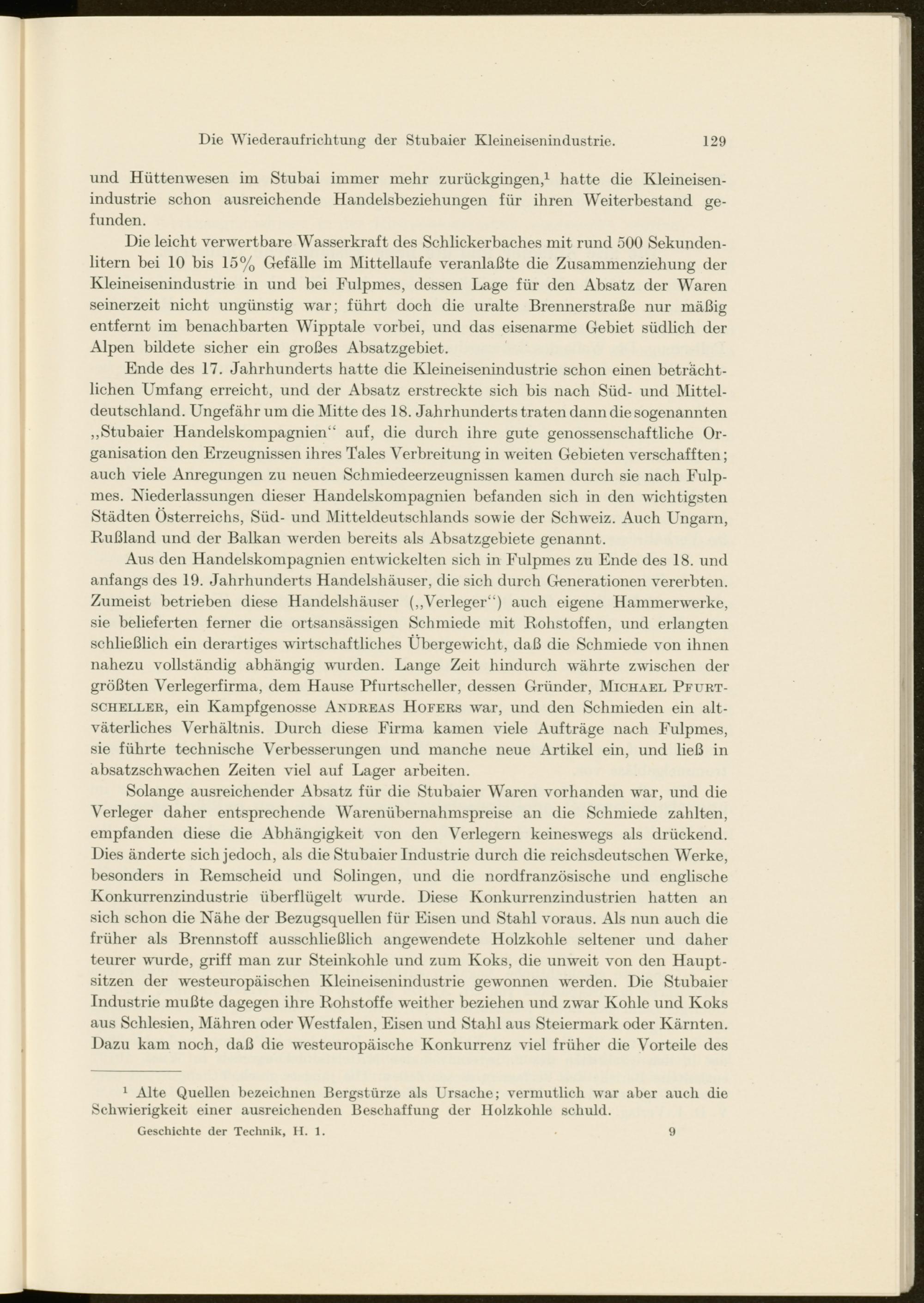 Solange ausreichender Absatz für die Stubaier Waren vorhanden war, und die Verleger daher entsprechende Warenübernahmspreise an die Schmiede zahlten, empfanden diese die Abhängigkeit von den Verlegern keineswegs als drückend. Dies änderte sich jedoch, als die Stubaier Industrie durch die reichsdeutschen Werke, besonders in Remscheid und Solingen, und die nordfranzösische und englische Konkurrenzindustrie überflügelt wurde. Diese Konkurrenzindustrien hatten an sich schon die Nähe der Bezugsquellen für Eisen und Stahl voraus. Als nun auch die früher als Brennstoff ausschließlich angewendete Holzkohle seltener und daher teurer wurde, griff man zur Steinkohle und zum Koks, die unweit von den Hauptsitzen der westeuropäischen Kleineisenindustrie gewonnen wurden. Die Stubaier Industrie mußte dagegen ihre Rohstoffe w'either beziehen und zwar Kohle und Koks aus Schlesien, Mähren oder Westfalen, Eisen und Stahl aus Steiermark oder Kärnten. Dazu kam noch, daß die westeuropäische Konkurrenz viel früher die Vorteile des