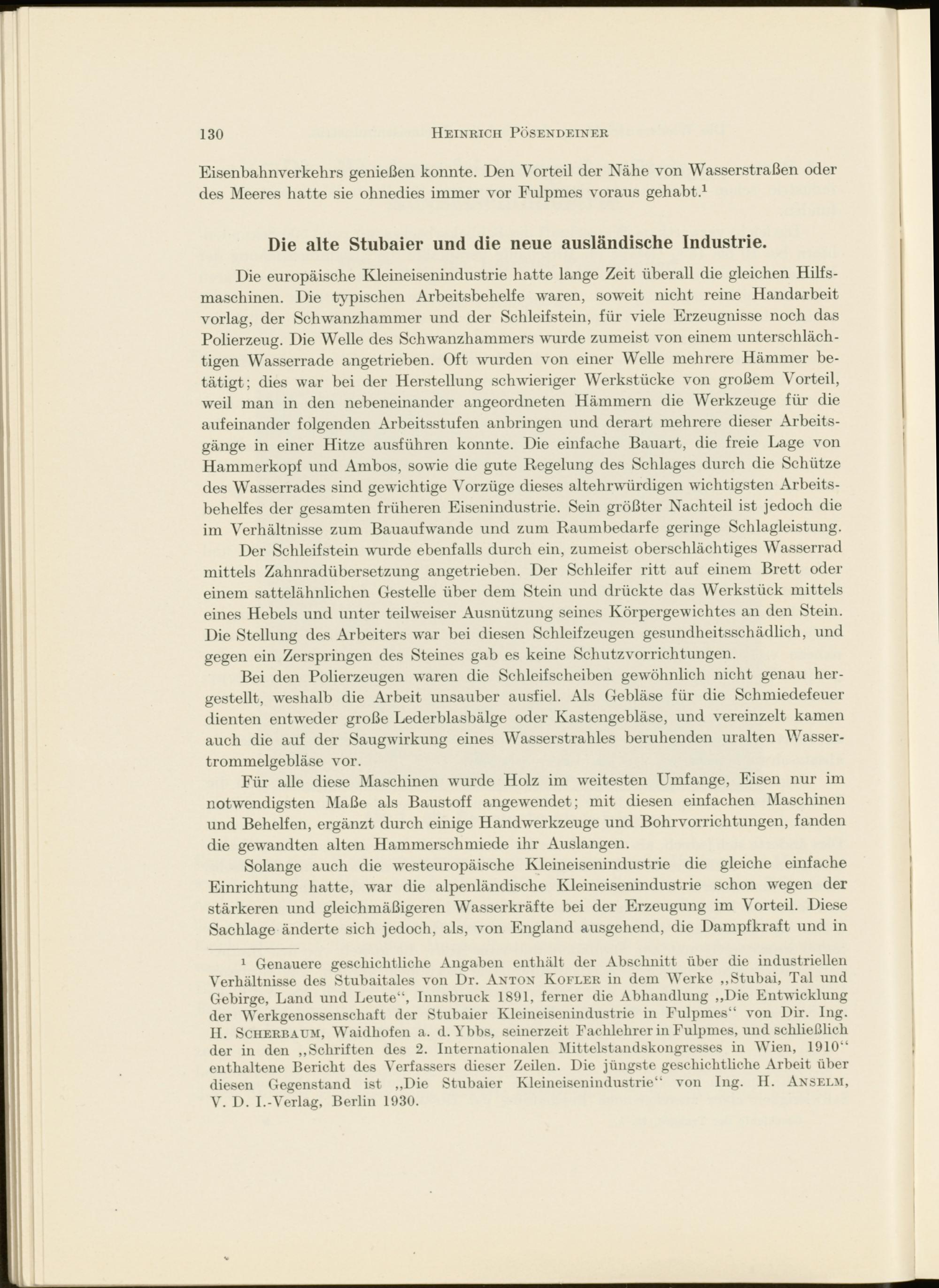 1 Genauere geschichtliche Angaben enthält der Abschnitt über die industriellen Verhältnisse des Stubaitales von Dr. Anton Kofler in dem Werke „Stubai, Tal und Gebirge, Land und Leute“, Innsbruck 1891, ferner die Abhandlung „Die Entwicklung der Werkgenossenschaft der Stubaier Kleineisenindustrie in Fulpmes“ von Dir. Ing.