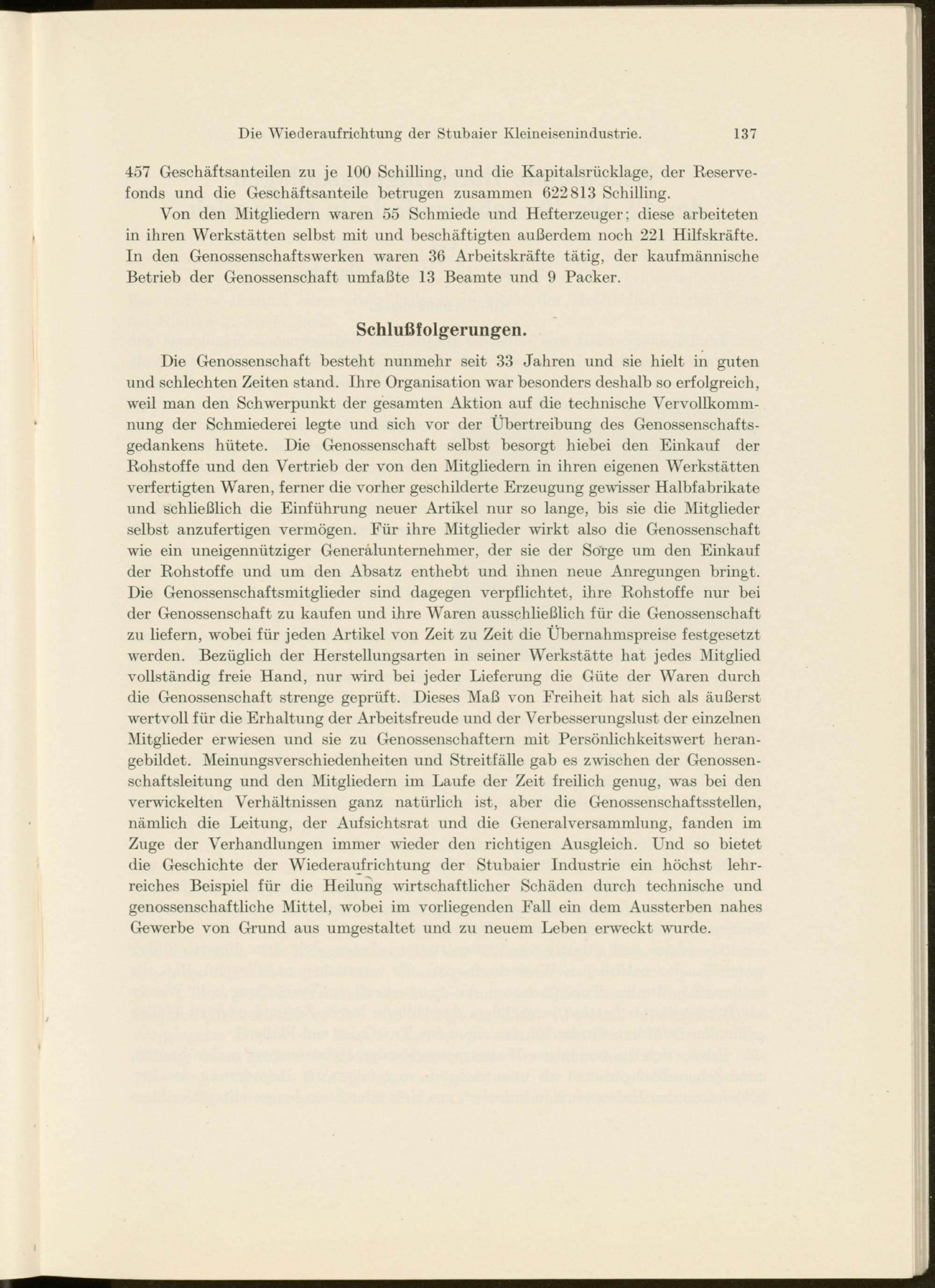 Die Genossenschaft besteht nunmehr seit 33 Jahren und sie hielt in guten und schlechten Zeiten stand. Ihre Organisation war besonders deshalb so erfolgreich, weil man den Schwerpunkt der gesamten Aktion auf die technische Vervollkommnung der Schmiederei legte und sich vor der Übertreibung des Genossenschaftsgedankens hütete. Die Genossenschaft selbst besorgt hiebei den Einkauf der Rohstoffe und den Vertrieb der von den Mitgliedern in ihren eigenen Werkstätten verfertigten Waren, ferner die vorher geschilderte Erzeugung gewisser Halbfabrikate und schließlich die Einführung neuer Artikel nur so lange, bis sie die Mitglieder selbst anzufertigen vermögen. Für ihre Mitglieder wirkt also die Genossenschaft wie ein uneigennütziger Generälunternehmer, der sie der Sorge um den Einkauf der Rohstoffe und um den Absatz enthebt und ihnen neue Anregungen bringt. Die Genossenschaftsmitglieder sind dagegen verpflichtet, ihre Rohstoffe nur bei der Genossenschaft zu kaufen und ihre Waren ausschließlich für die Genossenschaft zu liefern, wobei für jeden Artikel von Zeit zu Zeit die Übernahmspreise festgesetzt werden. Bezüglich der Herstellungsarten in seiner Werkstätte hat jedes Mitglied vollständig freie Hand, nur wird bei jeder Lieferung die Güte der Waren durch die Genossenschaft strenge geprüft. Dieses Maß von Freiheit hat sich als äußerst wertvoll für die Erhaltung der Arbeitsfreude und der Verbesserungslust der einzelnen Mitglieder erwiesen und sie zu Genossenschaftern mit Persönlichkeitswert herangebildet. Meinungsverschiedenheiten und Streitfälle gab es zwischen der Genossenschaftsleitung und den Mitgliedern im Laufe der Zeit freilich genug, was bei den verwickelten Verhältnissen ganz natürlich ist, aber die Genossenschaftsstellen, nämlich die Leitung, der Aufsichtsrat und die Generalversammlung, fanden im Zuge der Verhandlungen immer wieder den richtigen Ausgleich. Und so bietet die Geschichte der Wiederaufrichtung der Stubaier Industrie ein höchst lehrreiches Beispiel für die Heilung wirtschaftlicher Schäden durch technische und genossenschaftliche Mittel, wobei im vorliegenden Fall ein dem Aussterben nahes Gewerbe von Grund aus umgestaltet und zu neuem Leben erweckt wurde.