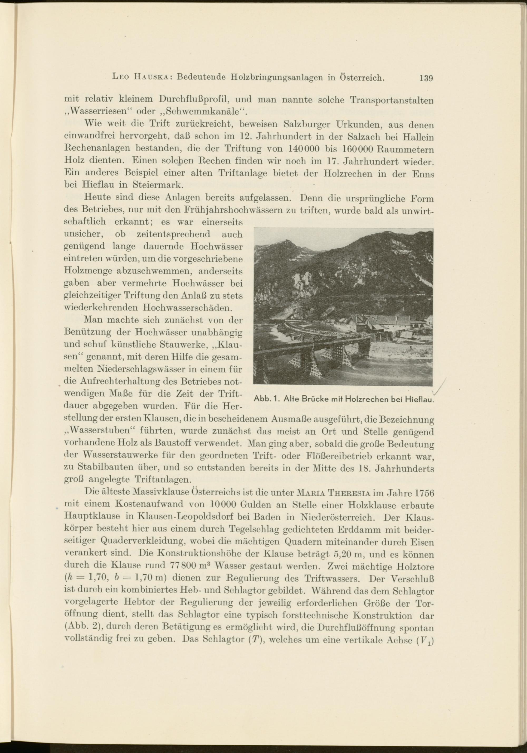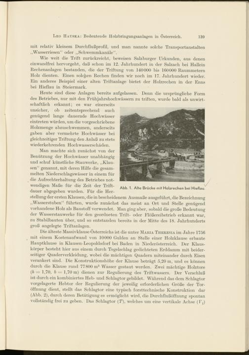 Die älteste Massivklause Österreichs ist die unter Maria Theresia im Jahre 1756 mit einem Kostenaufwand von 10000 Gulden an Stelle einer Holzklause erbaute Hauptklause in Klausen-Leopoldsdorf bei Baden in Niederösterreich. Der Klauskörper besteht hier aus einem durch Tegelschlag gedichteten Erddamm mit beiderseitiger Quader Verkleidung, wobei die mächtigen Quadern miteinander durch Eisen verankert sind. Die Konstruktionshöhe der Klause beträgt 5,20 m, und es können durch die Klause rund 77 800 m 3 Wasser gestaut werden. Zwei mächtige Holztore (h = 1,70, b = 1,70 m) dienen zur Regulierung des Triftwassers. Der Verschluß ist durch ein kombiniertes Heb- und Schlagtor gebildet. Während das dem Schlagtor vorgelagerte Hebtor der Regulierung der jeweilig erforderlichen Größe der Toröffnung dient, stellt das Schlagtor eine typisch forsttechnische Konstruktion dar (Abb. 2), durch deren Betätigung es ermöglicht wird, die Durchflußöffnung spontan vollständig frei zu geben. Das Schlagtor ( T ), welches um eine vertikale Achse (1^)