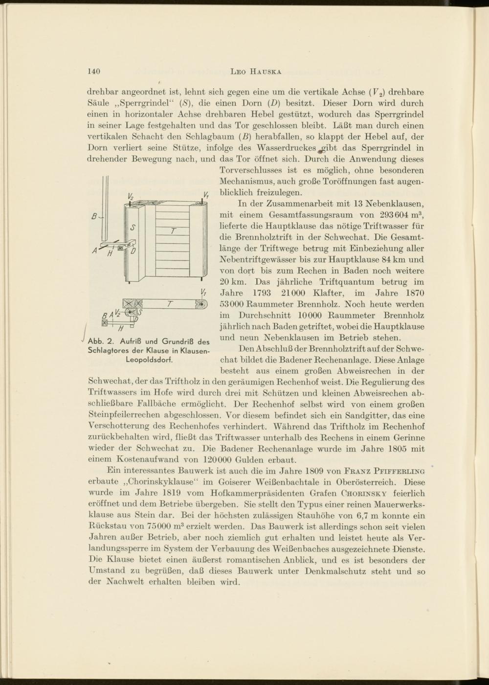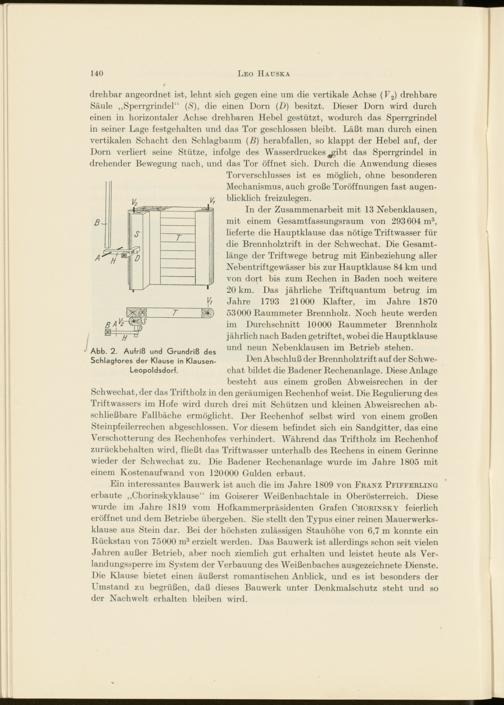 Ein interessantes Bauwerk ist auch die im Jahre 1809 von Franz Pfifferling erbaute „Chorinskyklause“ im Goiserer Weißenbachtale in Oberösterreich. Diese w'urde im Jahre 1819 vom Hofkammerpräsidenten Grafen Ohorinsky feierlich eröffnet und dem Betriebe übergeben. Sie stellt den Typus einer reinen Mauerw r erks- klause aus Stein dar. Bei der höchsten zulässigen Stauhöhe von 6,7 m konnte ein Rückstau von 75000 m 3 erzielt werden. Das Bauw'erk ist allerdings schon seit vielen Jahren außer Betrieb, aber noch ziemlich gut erhalten und leistet heute als Verlandungssperre im System der Verbauung des Weißenbaches ausgezeichnete Dienste. Die Klause bietet einen äußerst romantischen Anblick, und es ist besonders der Umstand zu begrüßen, daß dieses Bauwerk unter Denkmalschutz steht und so der Nachwelt erhalten bleiben wird.