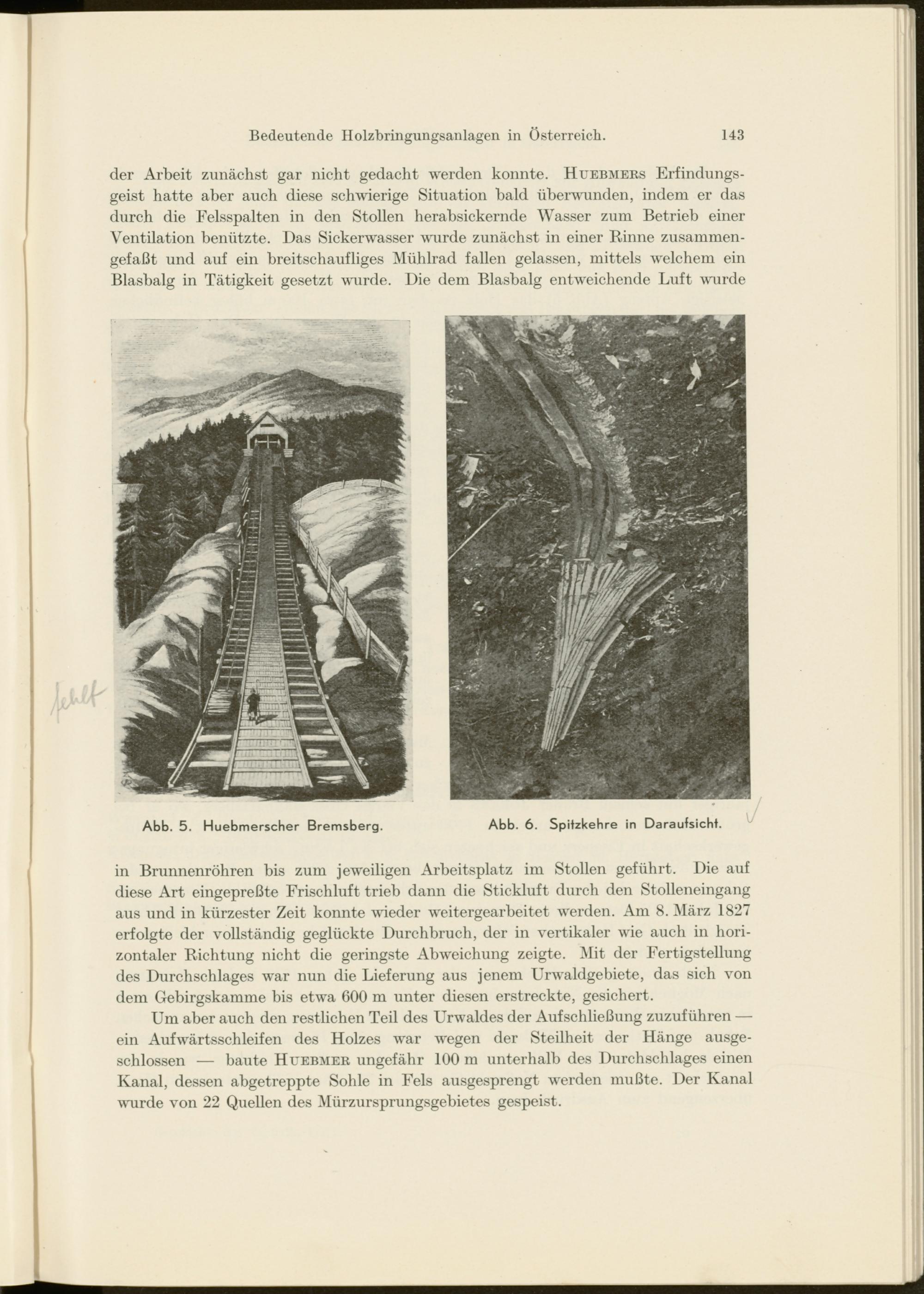 Um aber auch den restlichen Teil des Urwaldes der Auf Schließung zuzuführen — ein Aufwärtsschleifen des Holzes war wegen der Steilheit der Hänge ausgeschlossen — baute Huebmer ungefähr 100 m unterhalb des Durchschlages einen Kanal, dessen abgetreppte Sohle in Fels ausgesprengt werden mußte. Der Kanal wurde von 22 Quellen des Mürzursprungsgebietes gespeist.