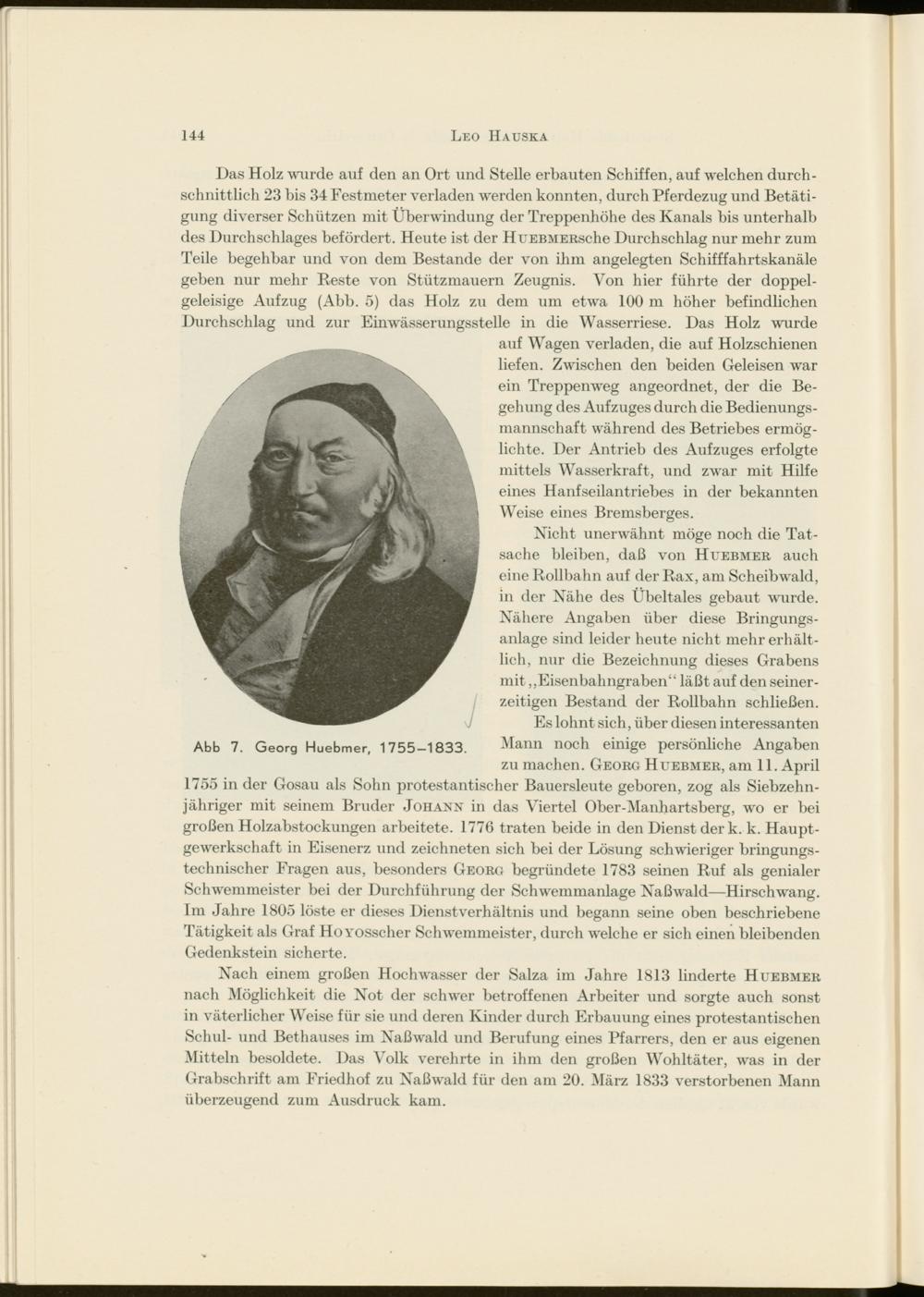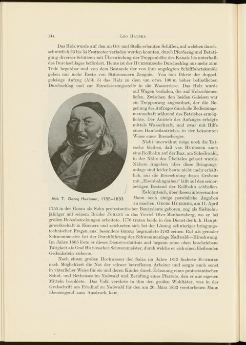 Es lohnt sich, über diesen interessanten Mann noch einige persönliche Angaben zu machen. Georg Htjebmer, am 11. April 1755 in der Gosau als Sohn protestantischer Bauersleute geboren, zog als Siebzehnjähriger mit seinem Bruder Johann in das Viertel Ober-Manhartsberg, w r o er bei großen Holzabstockungen arbeitete. 1776 traten beide in den Dienst der k. k. Hauptgewerkschaft in Eisenerz und zeichneten sich bei der Lösung schwieriger bringungstechnischer Fragen aus, besonders Georg begründete 1783 seinen Ruf als genialer Schwemmeister bei der Durchführung der Schwemmanlage Naßwald—Hirschw r ang. Im Jahre 1805 löste er dieses Dienstverhältnis und begann seine oben beschriebene Tätigkeit als Graf Hovosscher Schwemmeister, durch welche er sich einen bleibenden Gedenkstein sicherte.