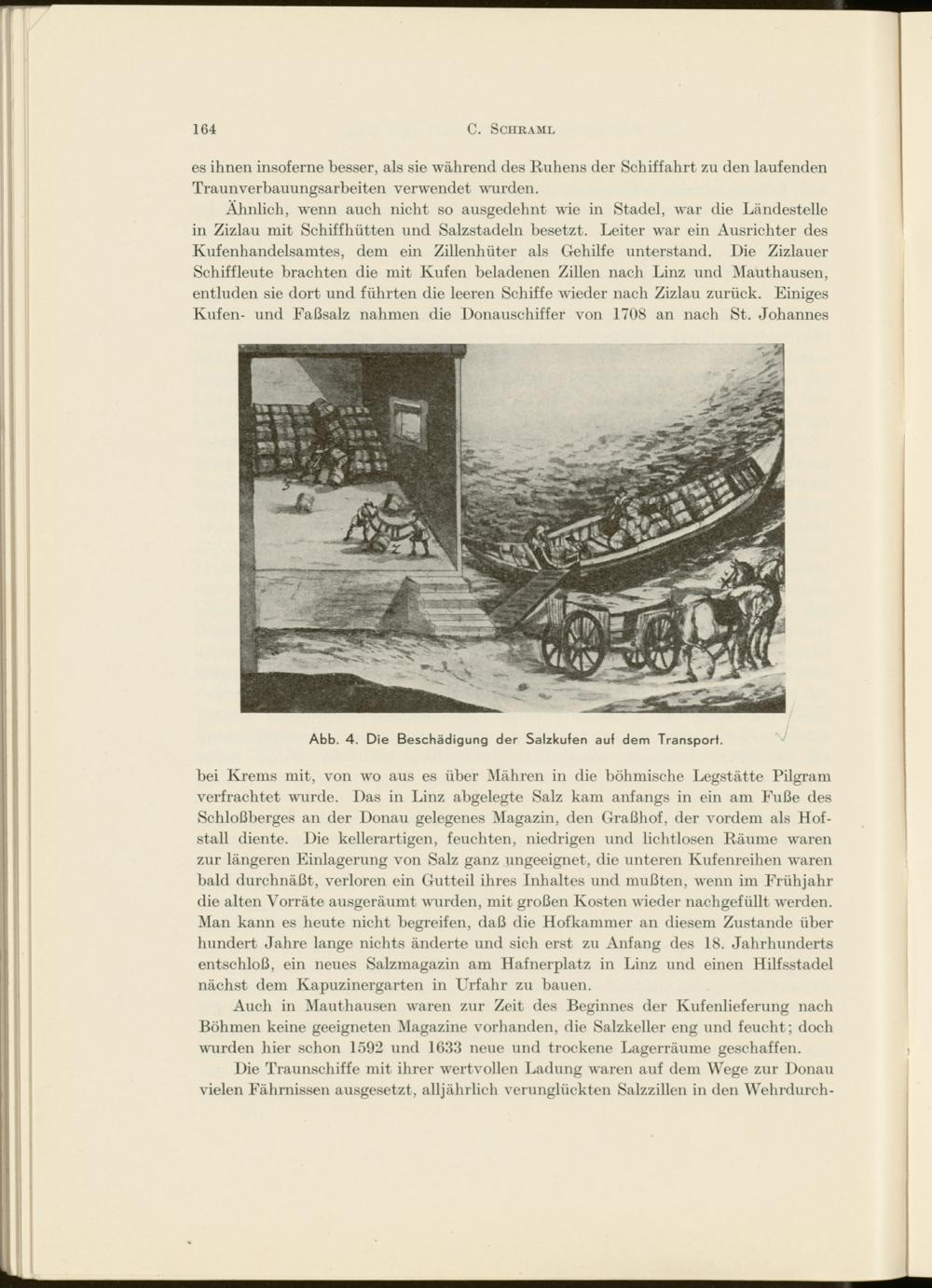 bei Krems mit, von wo aus es über Mähren in die böhmische Legstätte Pilgram verfrachtet wurde. Das in Linz abgelegte Salz kam anfangs in ein am Fuße des Schloßberges an der Donau gelegenes Magazin, den Graßhof, der vordem als Hof- stall diente. Die kellerartigen, feuchten, niedrigen und lichtlosen Räume waren zur längeren Einlagerung von Salz ganz ungeeignet, die unteren Kufenreihen waren bald durchnäßt, verloren ein Gutteil ihres Inhaltes und mußten, wenn im Frühjahr die alten Vorräte ausgeräumt wurden, mit großen Kosten wieder nachgefüllt werden. Man kann es heute nicht begreifen, daß die Hofkammer an diesem Zustande über hundert Jahre lange nichts änderte und sich erst zu Anfang des 18. Jahrhunderts entschloß, ein neues Salzmagazin am Hafnerplatz in Linz und einen Hilfsstadel nächst dem Kapuzinergarten in Urfahr zu bauen.