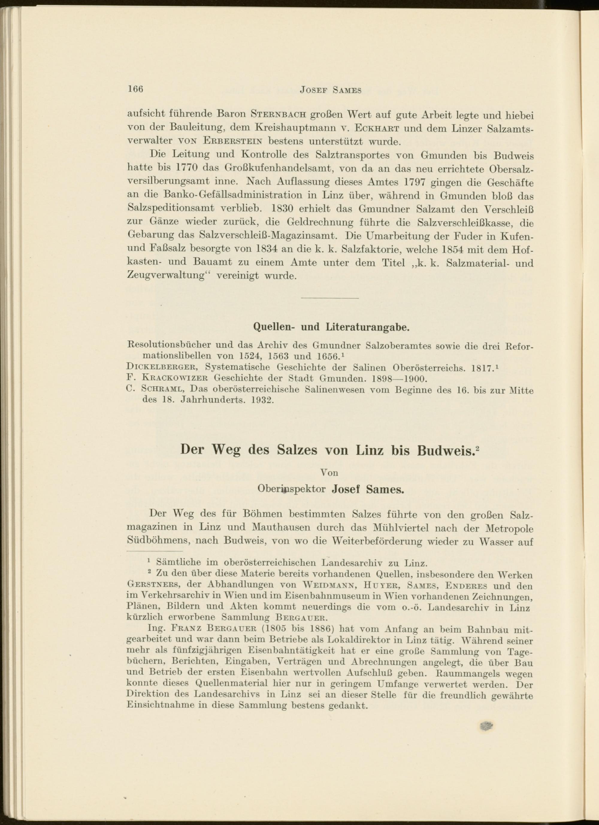 Ing. Franz Bergauer (1805 bis 1886) hat vom Anfang an beim Bahnbau mitgearbeitet und war dann beim Betriebe als Lokaldirektor in Linz tätig. Während seiner mehr als fünfzigjährigen Eisenbahntätigkeit hat er eine große Sammlung von Tagebüchern, Berichten, Eingaben, Verträgen und Abrechnungen angelegt, die über Bau und Betrieb der ersten Eisenbahn wertvollen Aufschluß geben. Raummangels wegen konnte dieses Quellenmaterial hier nur in geringem Umfange verwertet werden. Der Direktion des Landesarchivs in Linz sei an dieser Stelle für die freundlich gewährte Einsichtnahme in diese Sammlung bestens gedankt.