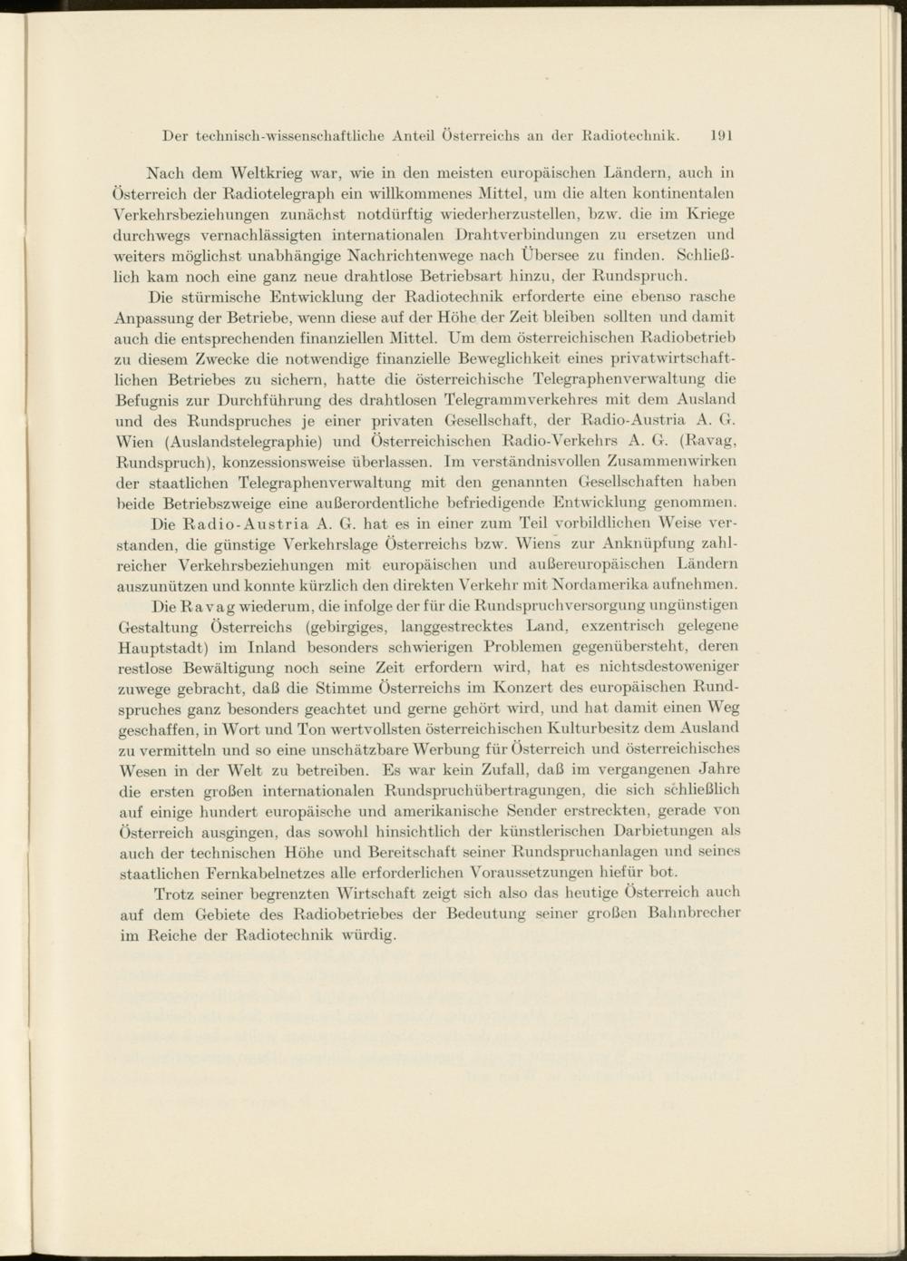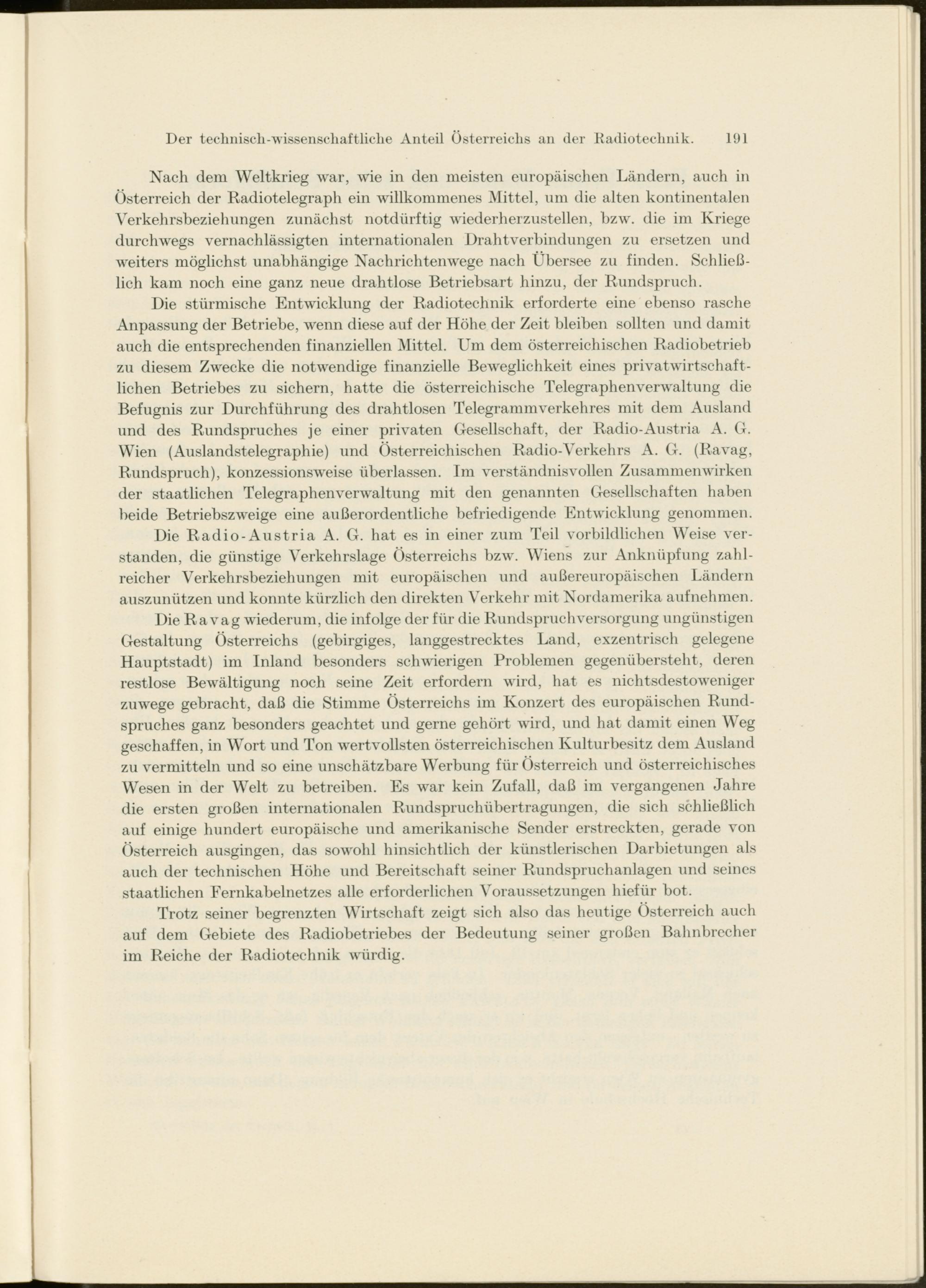 Die stürmische Entwicklung der Radiotechnik erforderte eine ebenso rasche Anpassung der Betriebe, wenn diese auf der Höhe der Zeit bleiben sollten und damit auch die entsprechenden finanziellen Mittel. Um dem österreichischen Radiobetrieb zu diesem Zwecke die notwendige finanzielle Beweglichkeit eines privatwirtschaftlichen Betriebes zu sichern, hatte die österreichische Telegraphenverwaltung die Befugnis zur Durchführung des drahtlosen Telegrammverkehres mit dem Ausland und des Rundspruches je einer privaten Gesellschaft, der Radio-Austria A. G. Wien (Auslandstelegraphie) und Österreichischen Radio-Verkehrs A. G. (Ravag, Rundspruch), konzessionsweise überlassen. Im verständnisvollen Zusammenwirken der staatlichen Telegraphenverwaltung mit den genannten Gesellschaften haben beide Betriebszweige eine außerordentliche befriedigende Entwicklung genommen.