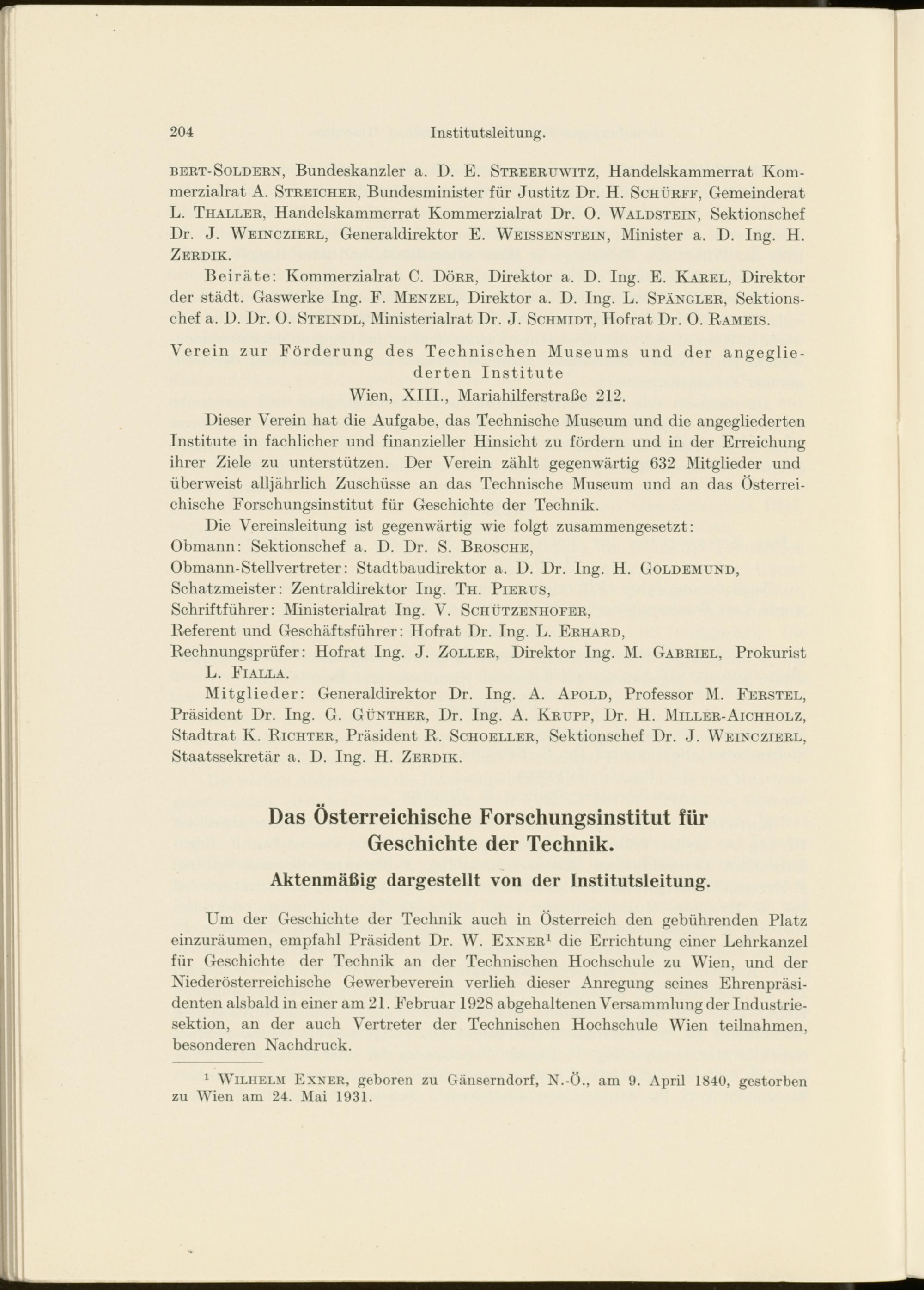 Um der Geschichte der Technik auch in Österreich den gebührenden Platz einzuräumen, empfahl Präsident Dr. W. Exner 1 die Errichtung einer Lehrkanzel für Geschichte der Technik an der Technischen Hochschule zu Wien, und der Xiederösterreichische Gewerbeverein verlieh dieser Anregung seines Ehrenpräsidenten alsbald in einer am 21. Februar 1928 abgehaltenen Versammlung der Industriesektion, an der auch Vertreter der Technischen Hochschule Wien teilnahmen, besonderen Nachdruck.