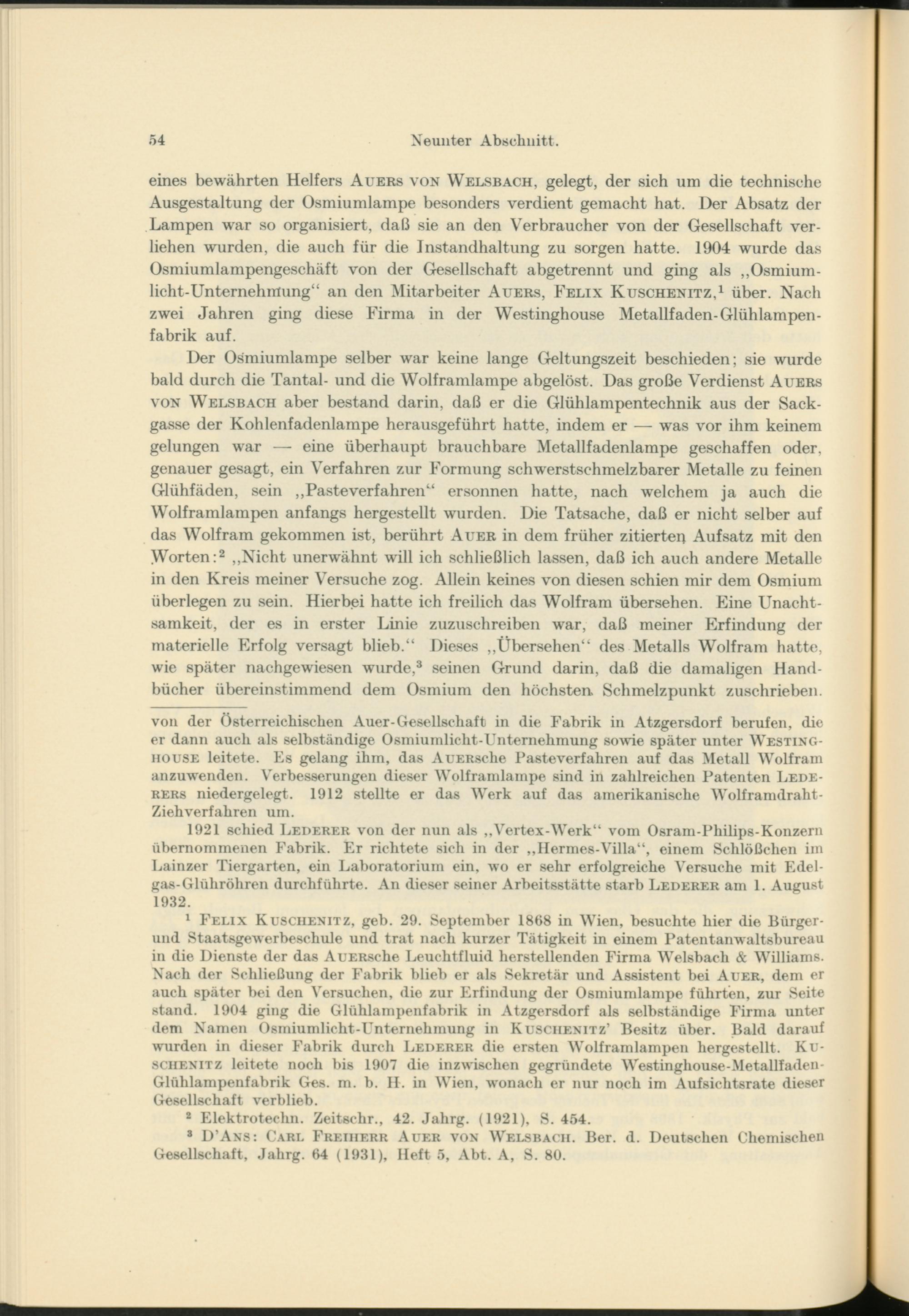 1 Felix Kuschenitz, geb. 29. September 1868 in Wien, besuchte hier die Bürgerund Staatsgewerbeschule und trat nach kurzer Tätigkeit in einem Patentanwaltsbureau in die Dienste der das AuERsche Leuchtfluid herstellenden Firma Welsbach & Williams. Nach der Schließung der Fabrik blieb er als Sekretär und Assistent bei Auer, dem er auch später bei den Versuchen, die zur Erfindung der Osmiumlampe führten, zur Seite stand. 1904 ging die Glühlampenfabrik in Atzgersdorf als selbständige Firma unter dem Namen Osmiumlicht-Unternehmung in Kusciienitz’ Besitz über. Bald darauf wurden in dieser Fabrik durch Lederer die ersten Wolframlampen hergestellt. Kuschenitz leitete noch bis 1907 die inzwischen gegründete Westingliouse-Metallfaden- Glühlampenfabrik Ges. m. b. II. in Wien, wonach er nur noch im Aufsichtsrate dieser Gesellschaft verblieb.